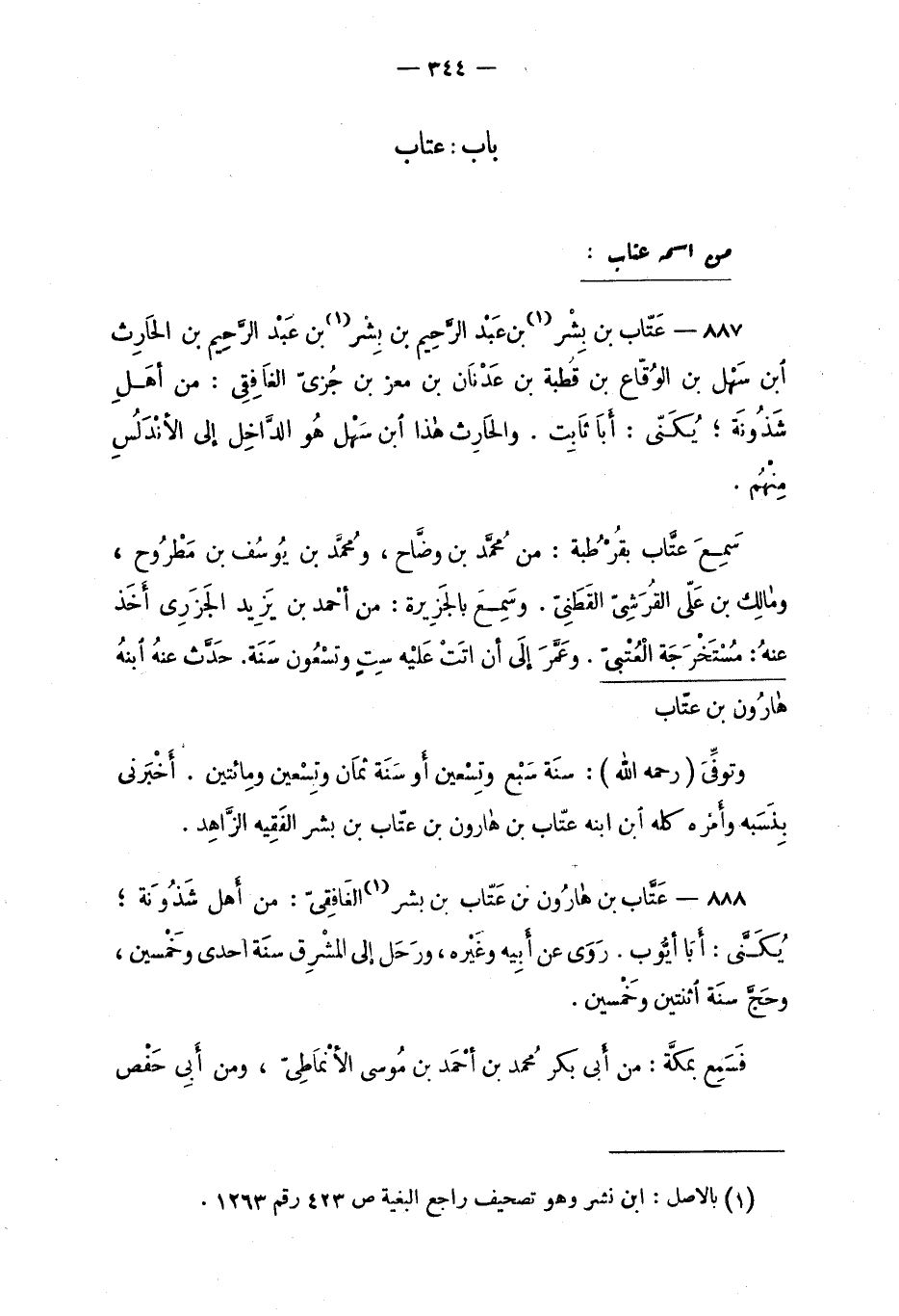 888 - عتّاب بن هارون بن عتّاب بن بِشْر الغافِقيّ: من أهل شَذُونَة؛ يُكنّى: أبا أيّوب. رَوَى عنه أبيه وغيره، ورحلَ إلى المَشْرِق سنة إحدى وخَمْسين، وحجّ سنة اثنتين وخَمْسين.