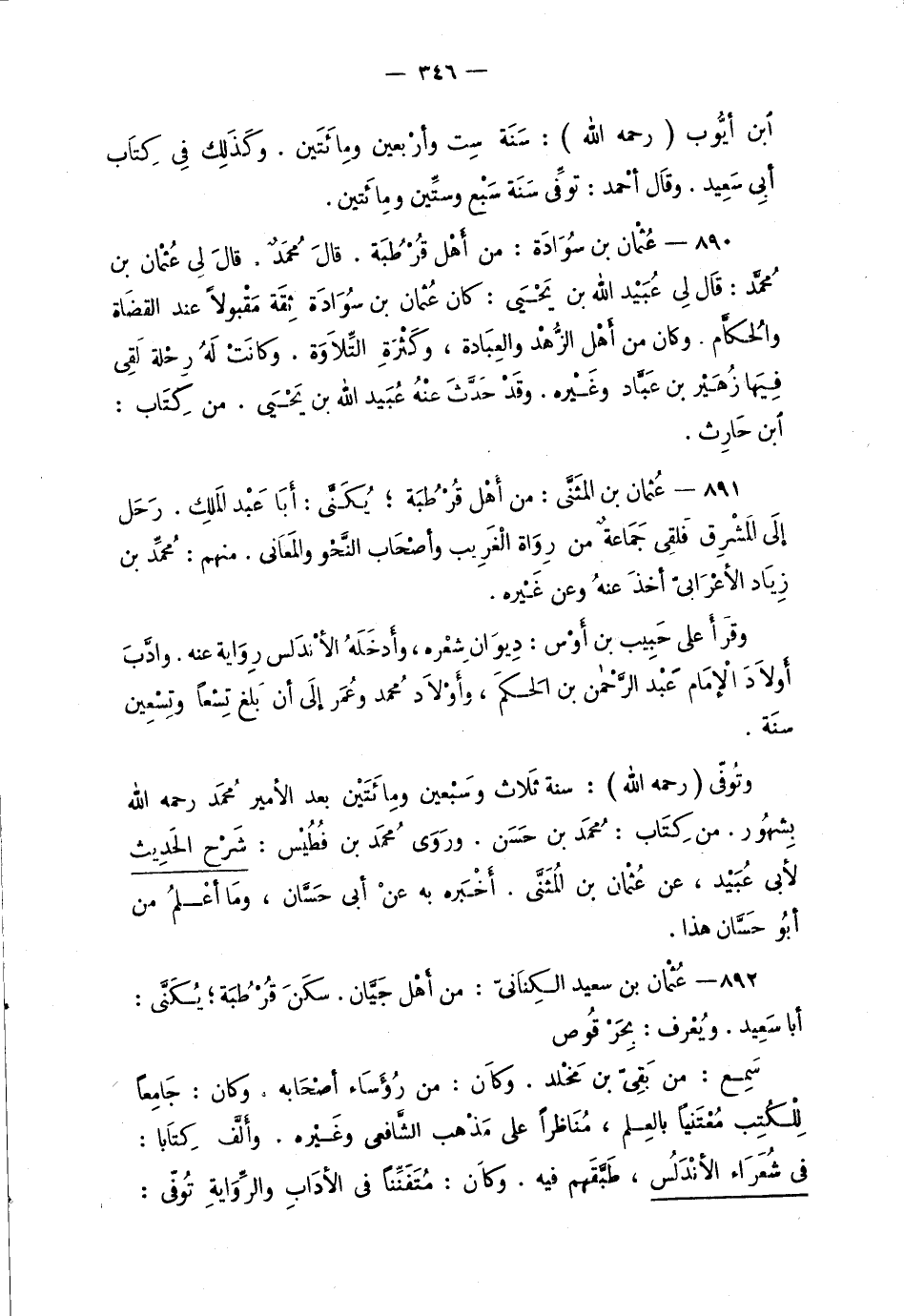 891 - عُثْمان بن المُثنّى: من أهل قُرطُبة؛ يُكنّى: أبا عبد الملِك. رحلَ إلى المَشْرِق فَلَقيَ جَماعةٌ من رُواة الغريب وأصحاب النّحو والمعانِي. منهُم: محمد بن زِياد الأعرابي وأخذَ عنهُ وعَن غيرهُ.