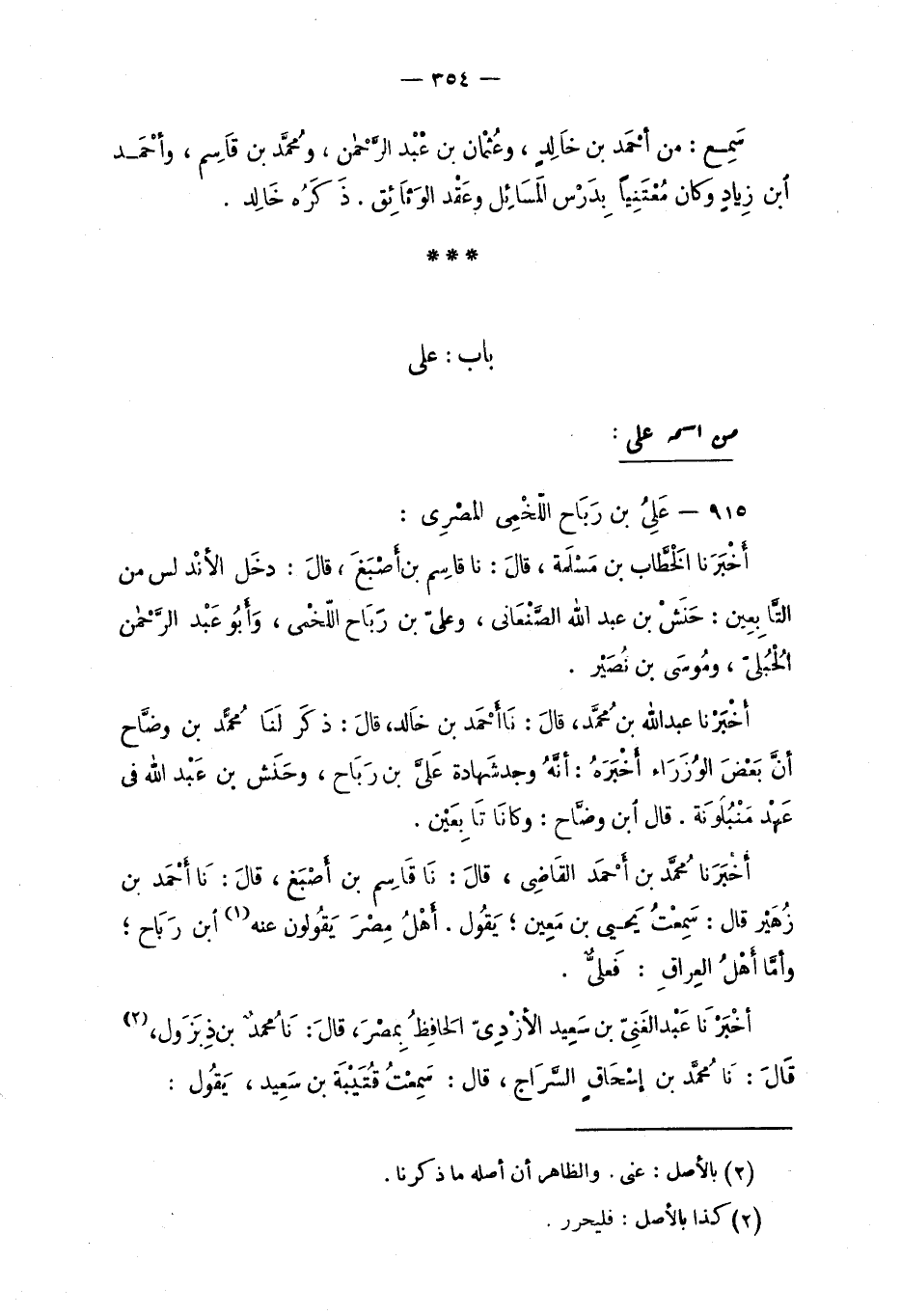 أَخْبَرْنا مُحمَّد بن أَحْمَد القَاضي، قالَ: نَا قَاسِم بن أَصْبَغ، قالَ: نَا أَحْمَد زُهَيْر قال: سَمِعْتُ يَحيى بن مَعِين؛ يَقُول. أَهْلَ مِصْرَ يَقُولون عنه ابن رَبَاح؛ وأمَّا أهْلُ العِراقِ: فَعليٌّ.