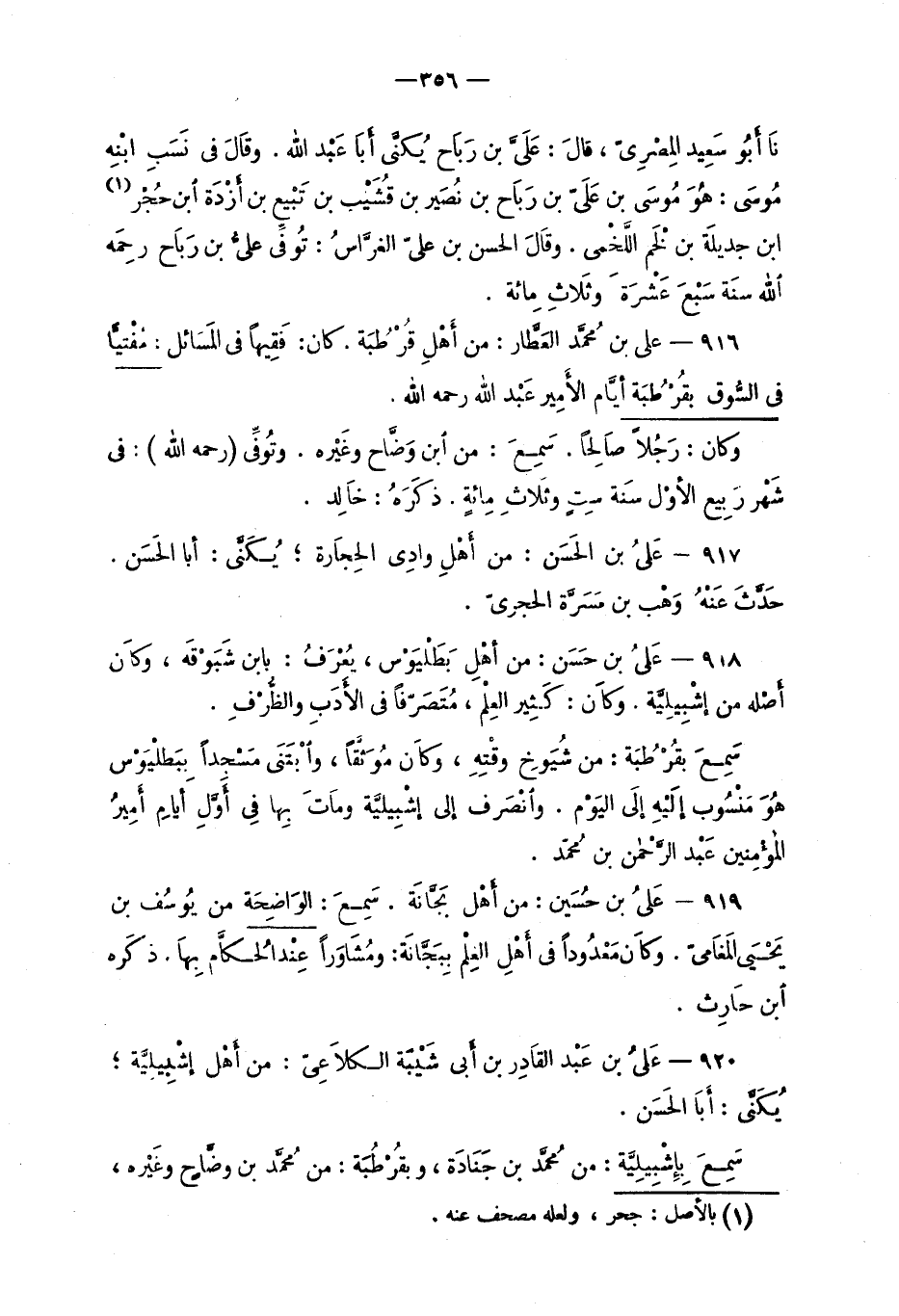 919 - عَليُ بن حُسَين: من أَهْل بَجَّانة. سَمِعَ: الوَاضِحَة من يُوسُف بن يَحْيَى المَغَاميّ. وكانَ مَعْدُوداً في أَهْلِ العِلْم بِبَجَّانَة: ومُشَاوَراً عِنْد الحُكَّام بِها. ذكَره ابن حَارِث.