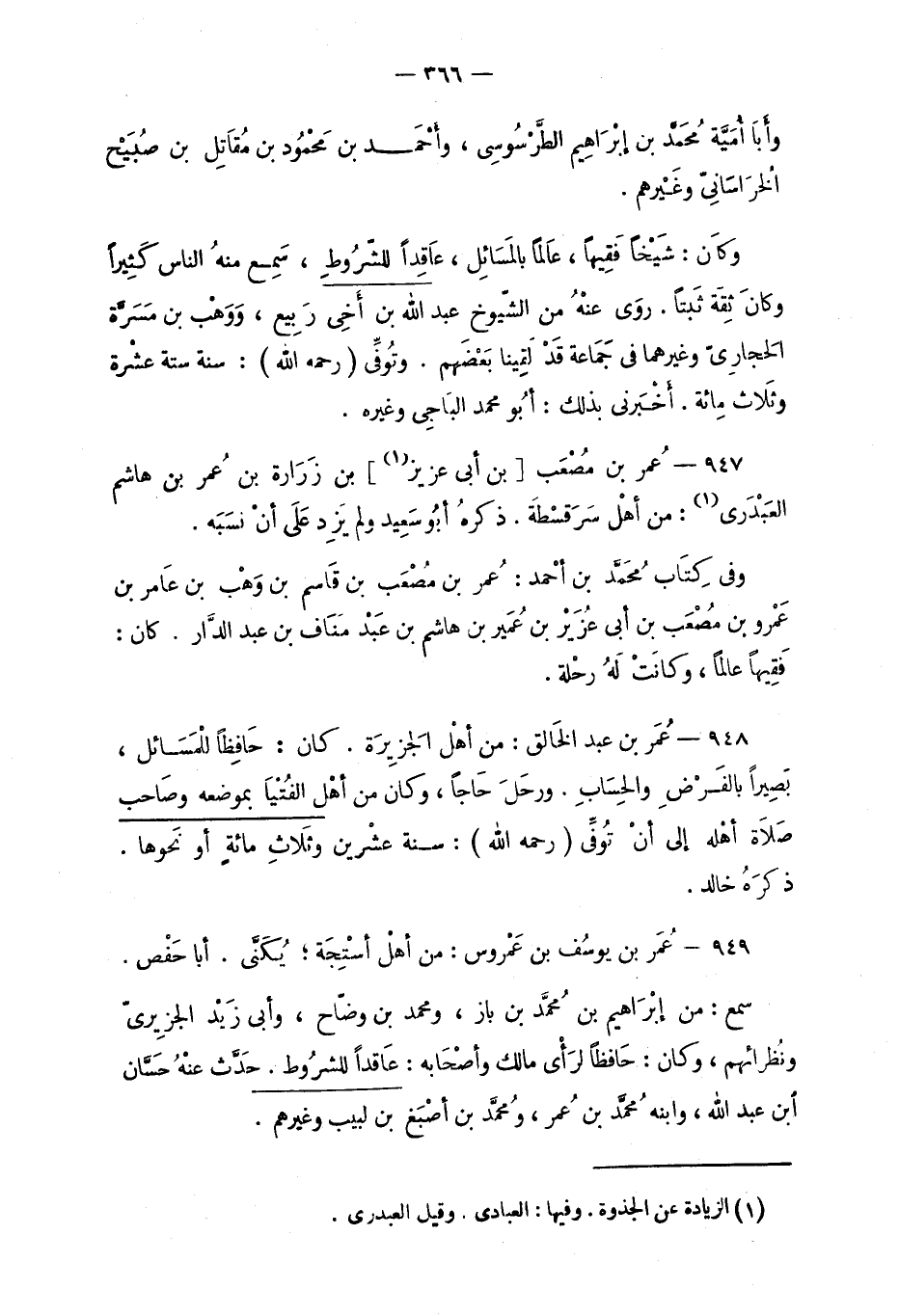 948 - عُمَر بن عبد الخَالِق: من أهْلِ الجَزِيرَة. كان: حَافِظاً للْمَسائِل، بَصِيراً بالفَرْض والحِسابِ. ورحَلَ حَاجاً، وكان من أهْل الفُتْيَا بموضعه وصَاحب صَلاَة أهْله إلى أنْتُوفِّيَ (رحمه الله) : سنة عشْرين وثَلاثِ مائةٍ أو نَحوها. ذكرَهُ خالد.
