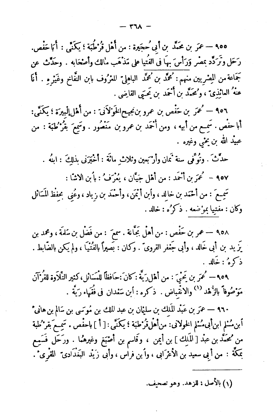 956 - عُمَر بن حَفْص بن عمرو بن نجيح الخَولاَنيّ: من أهْلِ إلْبِيرة؛ يُكَنَّى: أبَا حفْص. سَمِع من أبيه، ومن أَحْمَد بن عمرو بن مَنْصُور. وسَمِعَ بقُرْطُبة: من عبيْد الله بن يَحْيَى وغيره.