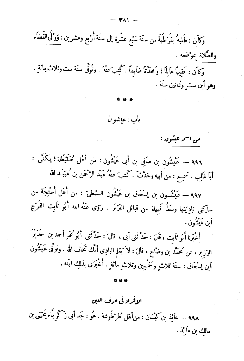 996 - عَيْشُون بن صاَفِي بن اَبي عَيْشُون: من أهْل طُلَيْطُلة؛ يُكَنَّى: أبَا غَالِب. سَمِع: من ابيه وحَدَّث. كَتَب عنْهُ عِبْد الرَّحمن بن عُبَيد الله.