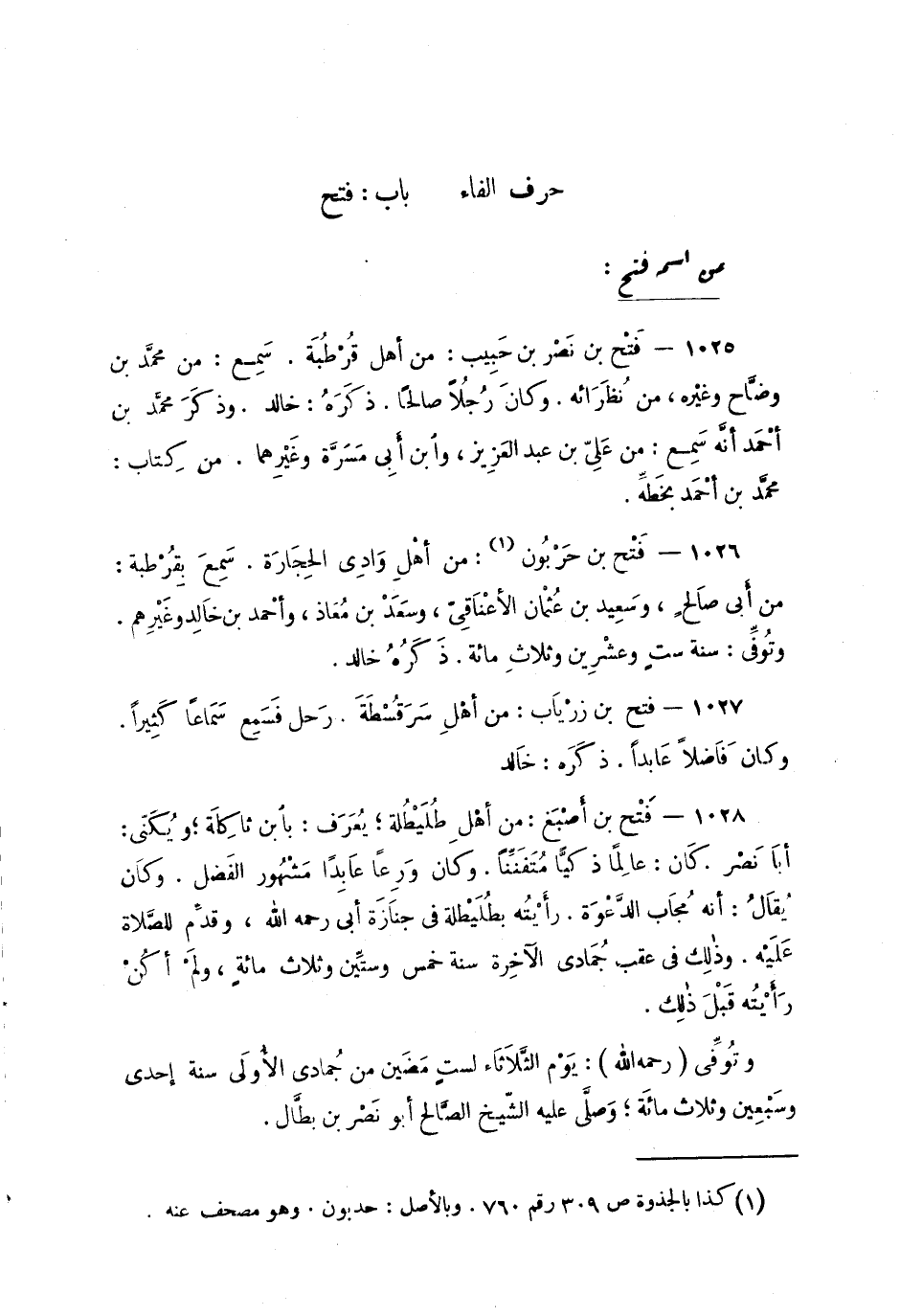 1025 - فَتْح بن نَصْر بن حَبِيب: من أهل قُرْطُبة. سَمِع: من محمَّد بن وضَّاح وغيْره، من نُظَرائه. وكانَ رُجُلاً صالحاً. ذكَرَهُ: خالد. وذكَرَ محمَّد بن أحمَد أَنَّه سَمِع: من عَلِيّ بن عبد العزيز، وابن أبِي مَسَرَّة وغَيْرِهما. من كِتاب محمَّد بن أحمَد بخَطِّه.