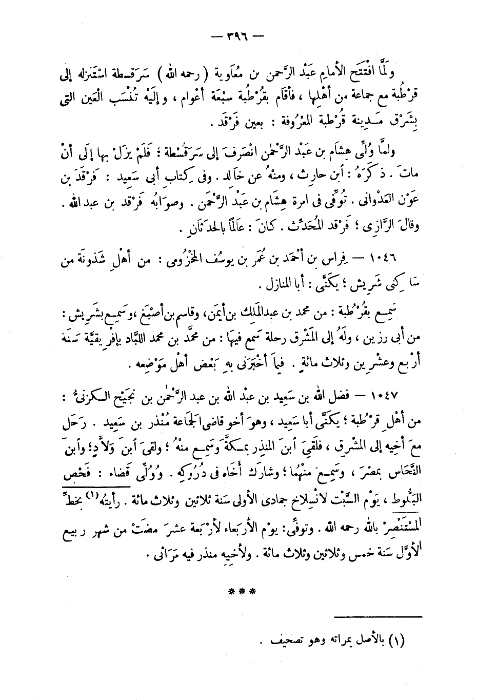 1047 - فضل الله بن سَعَيد بن عبْد الله بن عبد الرحمن بن نجَيْح الكزنيُّ: من أهْل قرْطُبة؛ يُكَنَّى: أبا سَعِيد، وهوَ أخو قاضي الجَمَاعة مُنْذر بن سَعيد. رَحَل معَ أخيه إلى المشْرِق، فَلَقي ابنَ المنذِر بمكَّة وسَمِع منْهُ؛ ولقى ابنَ وَلاَّدٍ؛ وابنَ النَّحاس بمصْرَ، وسَمِع منْهُما؛ وشارَك أخَاه دُرُوكِه. وُوُلَّي قَضاء: فَحْص البَلُّوط، يَوْم السَّبْت لانْسِلاخ جمادى الأولى سَنة ثلاثين وثلاث مائة. رأيتُه بخطِّ المسْتَنْصِرْ بالله رحمه الله. وتُوفِّيَ: يْوم الأرَبعاء لأرْبَعة عشرَ مضَتْ من شهر ربيع الأوَّل سَنة خمس وثلاثين وثلاث مائة. ولأخيِهِ منذر فيه مَرَائي.