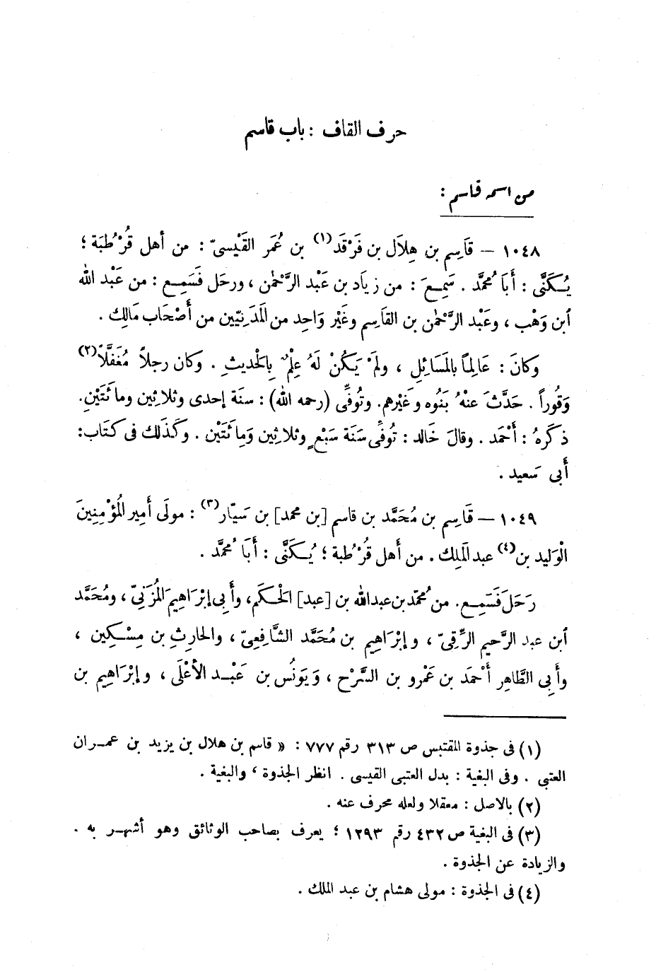 1049 - قَاسِم بن مُحَمَّد بن قاسم بن محمد بن سَيّار: مولَى أَمِير المؤْمِنينَ الْوَليد بن عبد المَلِك. من أَهل قُرْطُبة؛ يُكَنَّى: أبا مُحمَّد.