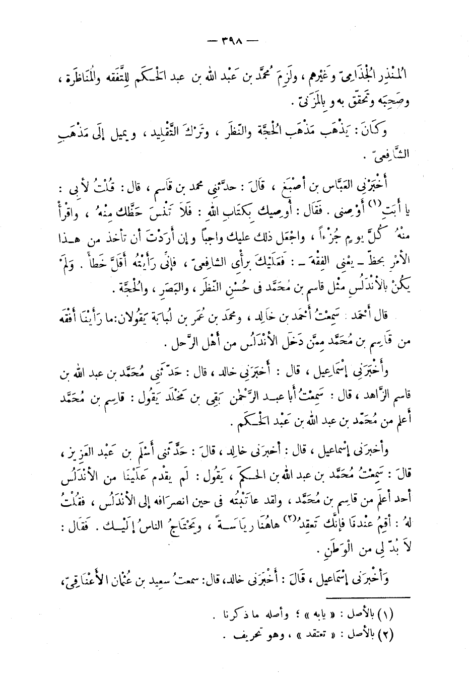 وأََخْبَرَنِي إسْمَاعِيل، قال: أخبَرَني خالد، قال: حَدّثَني مُحَمَّد بن عبد الله بن قاسم الزَّاهد، قال: سَمِعتُ أَبا عبد الرَّحمن بَقِي بن مَخْلَد يَقُول: قاسِم بن مُحَمَّد أَعلم من مُحَمّد بن عبد الله بن عَبد الحَكَم.