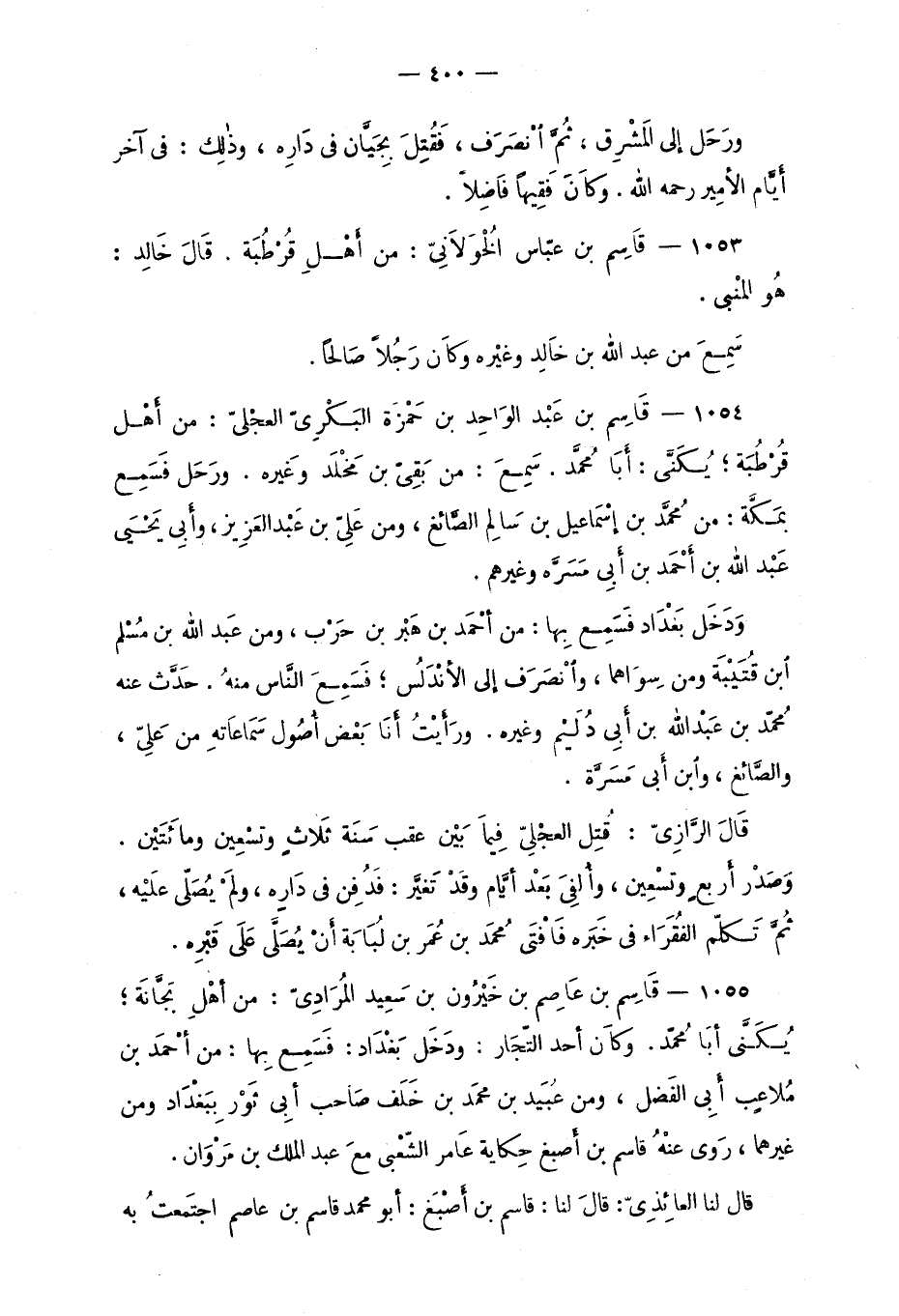 1055 - قَاسِم بن عَاصِم بن خَيْرُون بن سعِيد المُرَادِيّ: من أهْلِ بِجَّانَة؛ يُكَنَّى: أبا مُحمّد. وكانَ أحد التّجار: ودَخَل بَغْدَاد: فسَمِع بها: من أحمَد بن مُلاعِب أَبِي الفَضل، ومن عُبَيد بن محمد بن خَلَف صَاحب أبِي ثَوْر بِبَغْدَاد ومن غيرهما، رَوَى عنْهُ قاسم بن أَصبغ حِكاية عَامر الشّعبي معَ عبد الملك بن مَرْوَان.