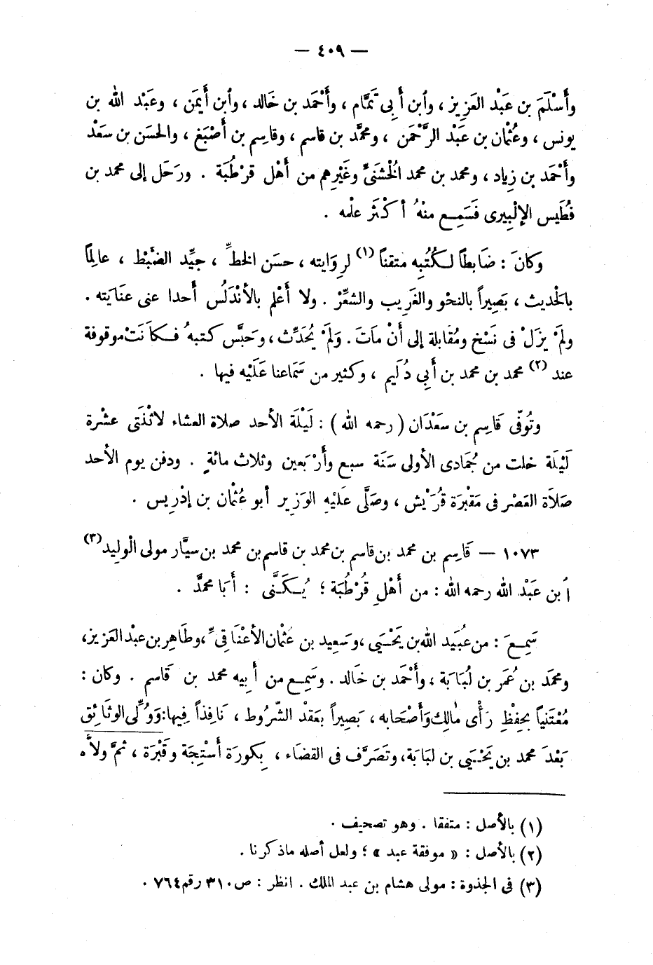 1073 - قَاسِم بن محمد بن قاسم بن محمد بن قاسم بن محمد بن سيَّار مولى الولِيد ابن عَبْد الله رحمه الله: من أهْلِ قُرْطُبة؛ يُكَنَّى: أبا محمَّد.