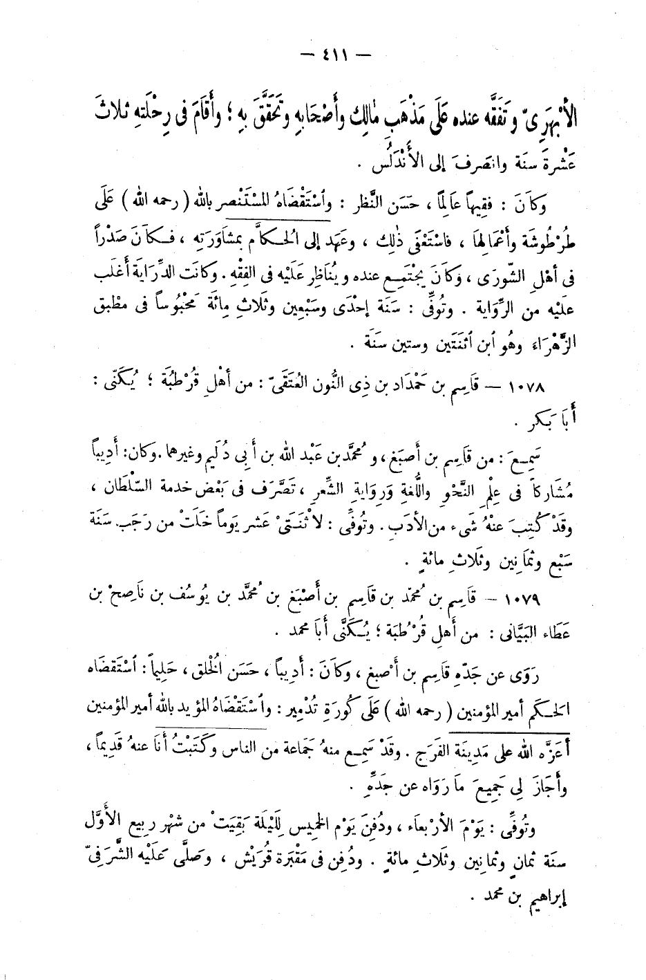 1079 - قَاسِم بن مُحمّد بن قَاسِم بن أَصبَغ بن مُحمَّد بن يُوسُف بن نَاصِحْ بن عَطَاء البَيَّاني: من أهلِ قُرْطُبة؛ يُكَنَّى: أبا محمد.
