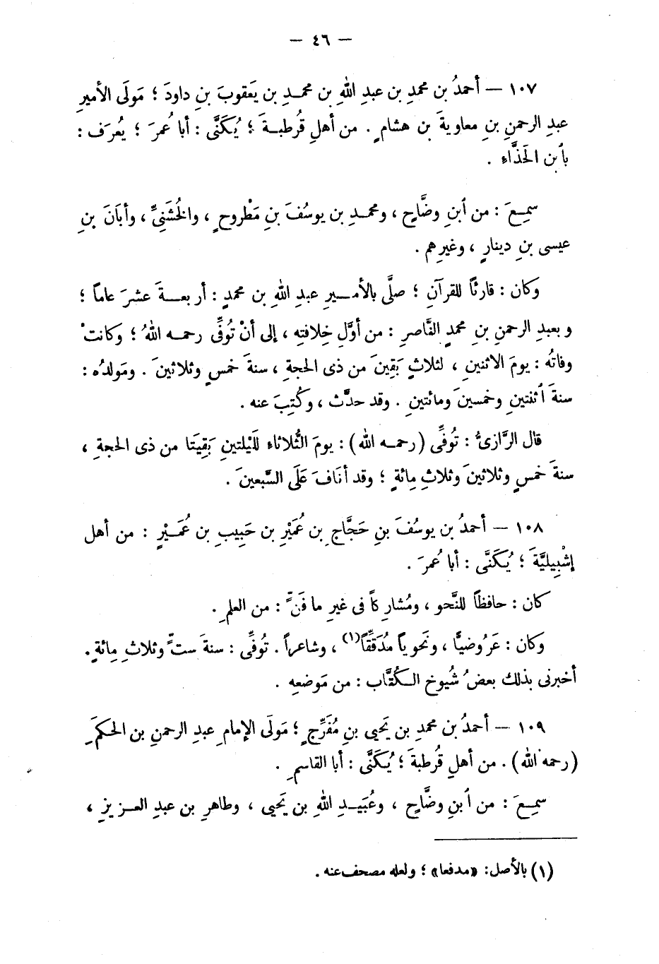 109 - أحمد بن محمد بن يحيى بن مُفَرِّجٍ؛ مَولى الإمامِ عبد الرحمن بن الحكَمِ (رحمه الله) . من أهلِ قُرطبةَ؛ يكنّى: أبا القاسِم.