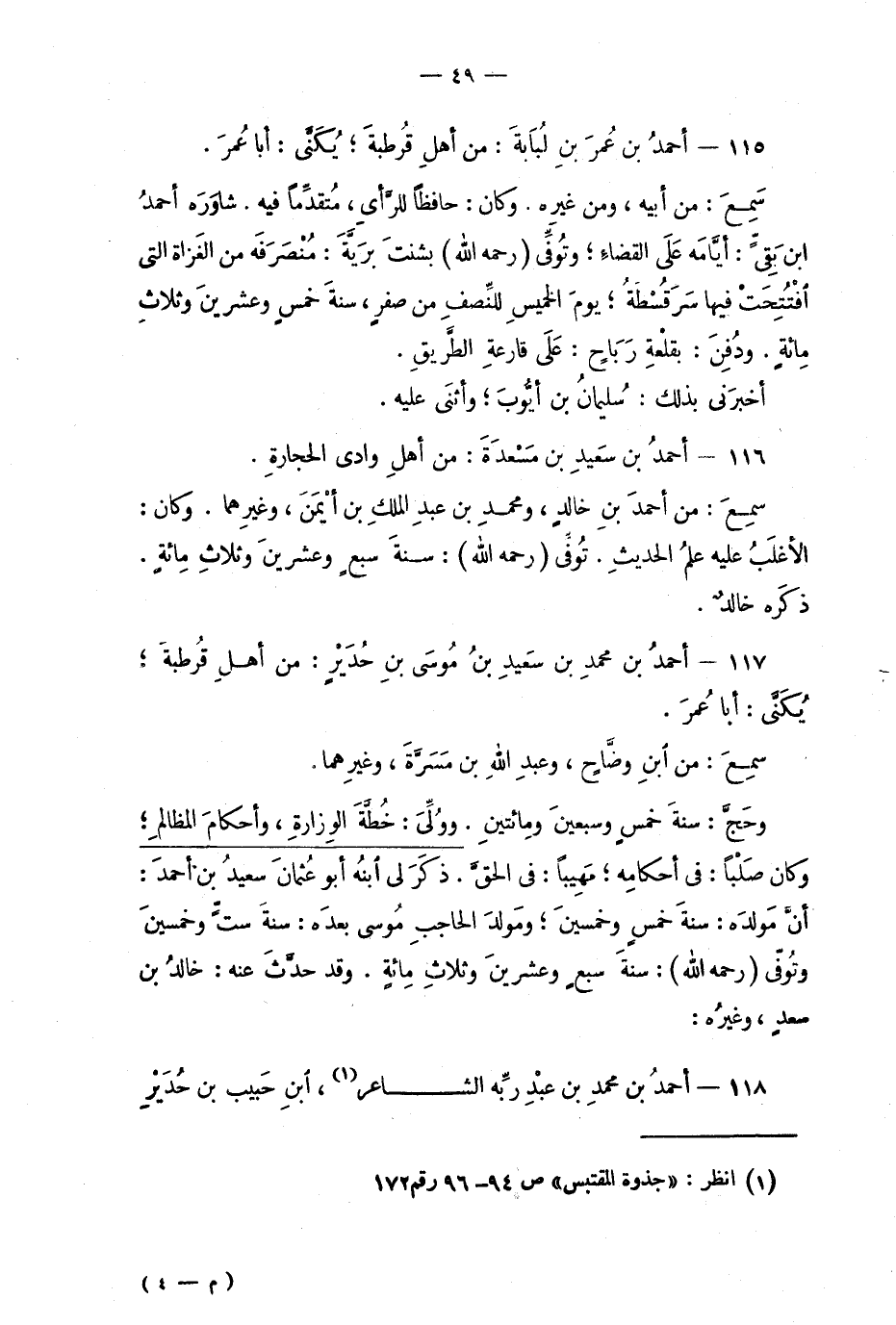 117 - أحمدُ بن محمدِ بن سَعيدٍ بنُ مُوسَى بنِ حُدَيرٍ: من أهلِ قُرطبةُ؛ يُكَنَّى: أبا عُمرَ.