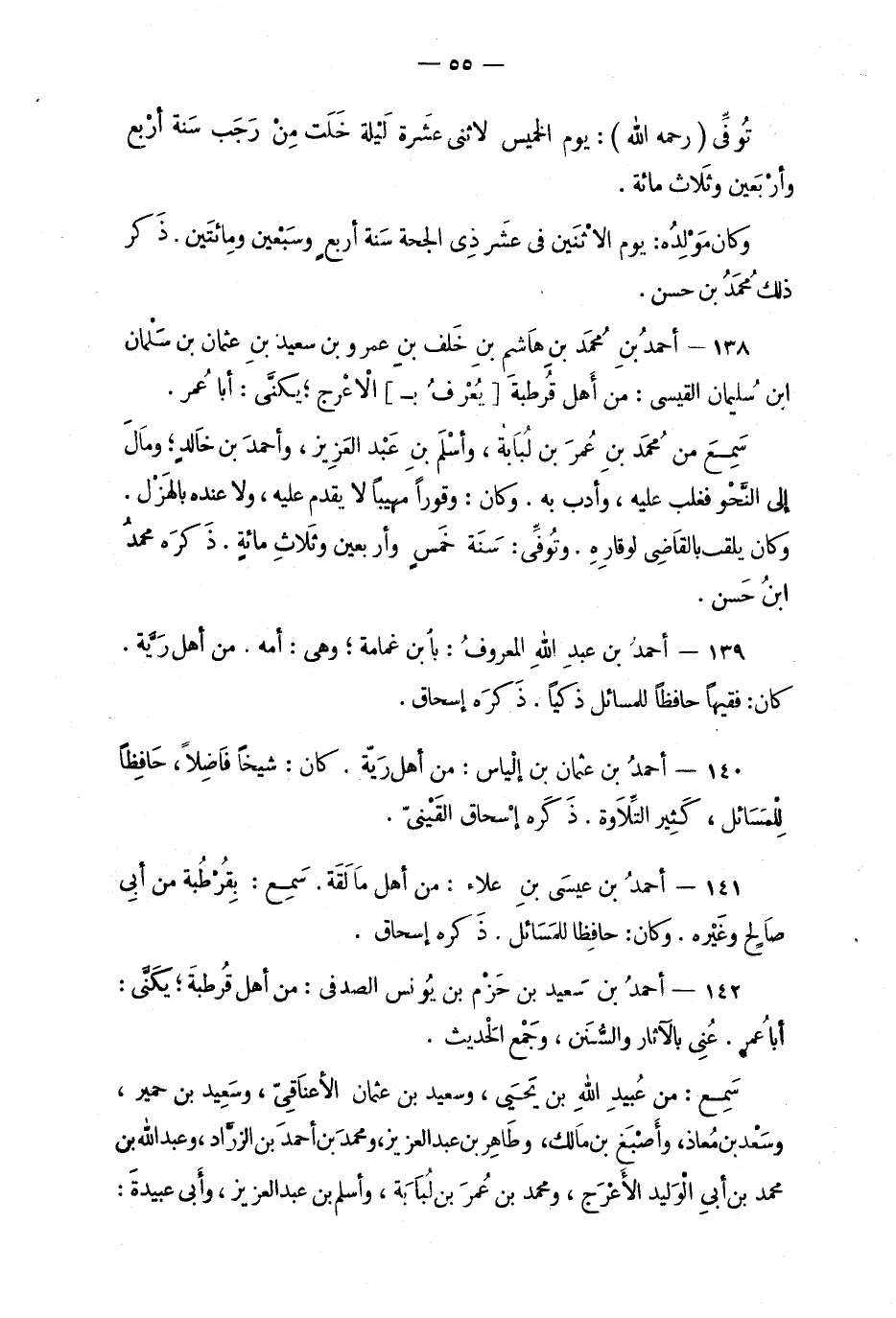 138 - أحمدُ بنِ مُحَمد بنِ هَاشم بن خَلف بن عمرو بن سعيد بن عثمان بن سَلْمان ابن سُليمان القيسي: من أهل قُرطبةَ يُعرَفُ بالاْعْرج؛ يُكَنَّى: أبا عُمر.