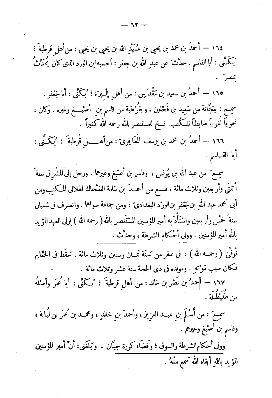 166 - أحمدُ بن محمد بن يوسف المُعَافِريّ: من أهلِ قُرطبةَ؛ يُكَنَّى: أبا القاسم.