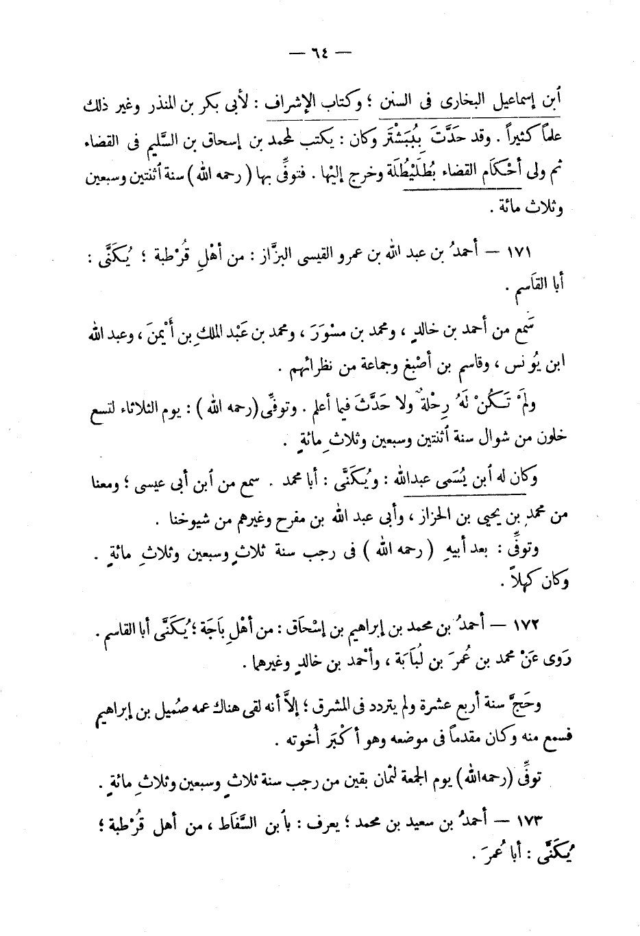 171 - أحمدُ بن عبد الله بن عمرو القيسي البزَّاز: من أهلِ قُرْطبة؛ يُكَنَّى: أبا القَاسم.