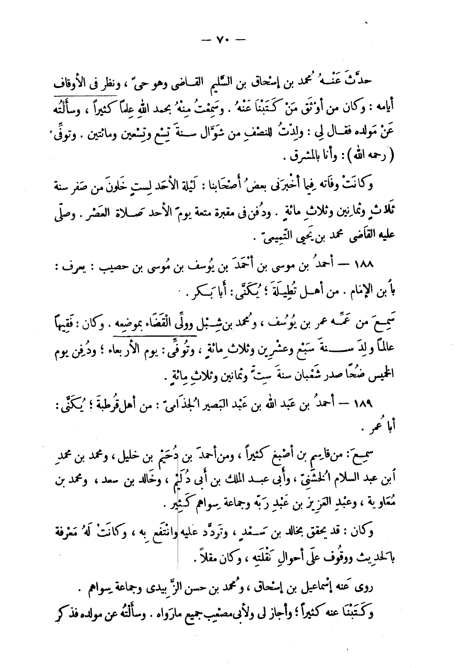 188 - أحمدُ بن موسى بن أحمدَ بن يُوسف بن مُسى بن حصيب: يعرف بابن الإمام. من أهل تُطِيلَةَ؛ يُكَنَّى: أبا بَكر.