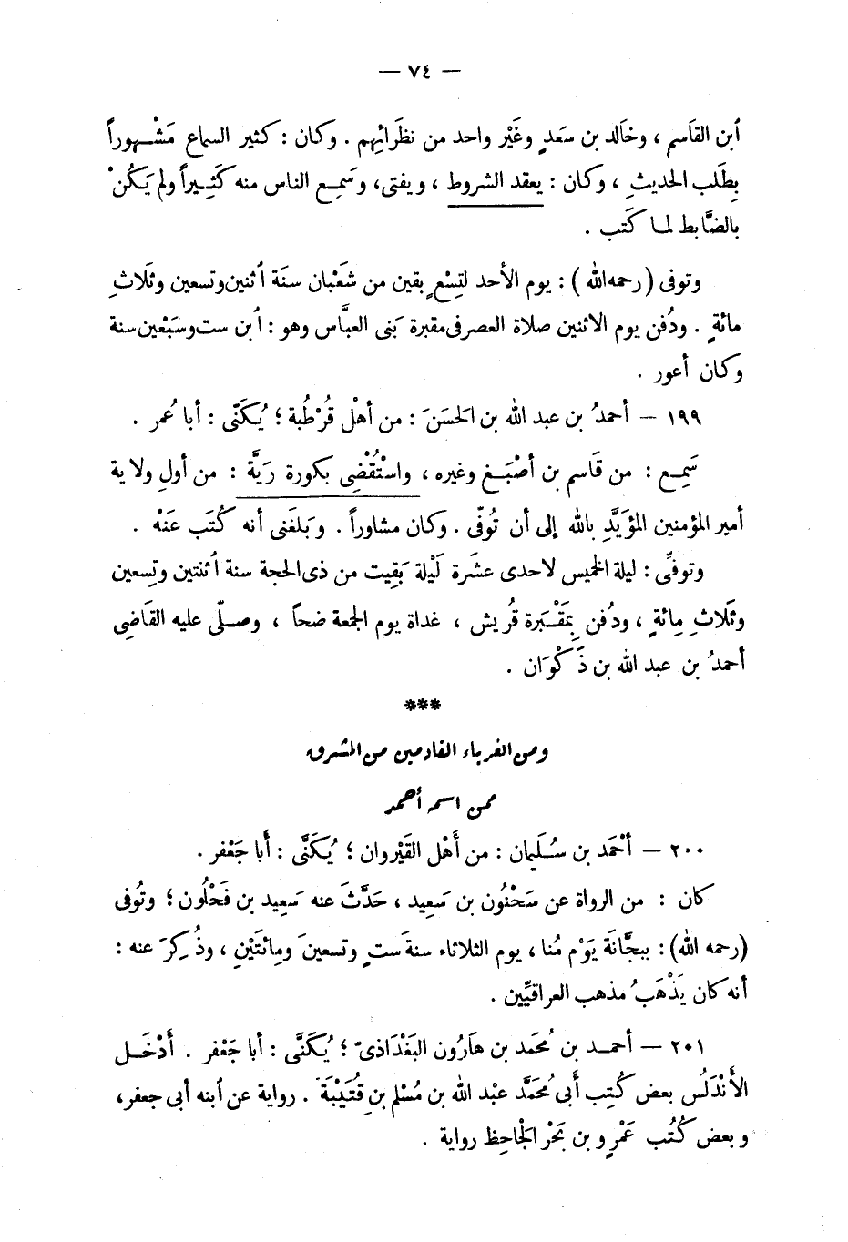 201 - أحمد بن مُحمد بن هَارُون البَغْداديّ؛ يُكَنَّى: أبا جَعْفر. أدخَل الأنْدَلُس بعض كُتب أبي مُحمد عبْد الله بن مُسْلم ين قُتَيْبَةَ. رواية عن ابنه أبي جعفر، وبعض كُتُب عَمرٍو بن بَحْر الجَاحِظ رواية.