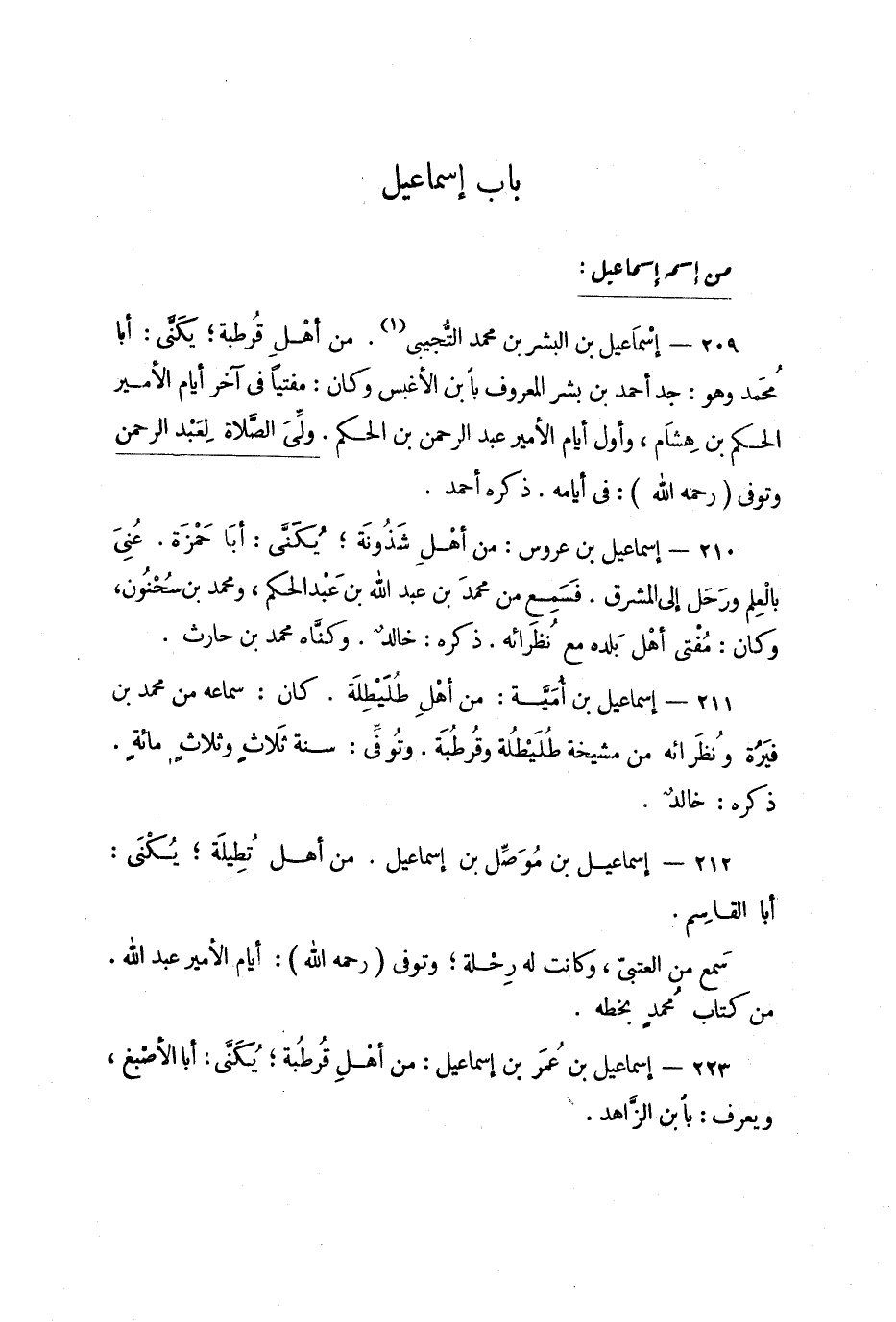 209 - إسْمَاعيل بن البشر محمد التُّجيبي. من أهْلِ قُرطبة؛ يُكَنَّى: أبا مُحَمد وهو: جد أحمد بن بشر المعروف بابن الأغبس وكان: مفتياً في آخر أيام الأمير الحكم بن هِشَام، وأول أيام الأمير عبد الرحمن بن الحكم. ولِّىَ الصَّلاة لِعَبْد الرحمن وتُوفِّيَ (رحمه الله) : في أيامه. ذكره أحمد.