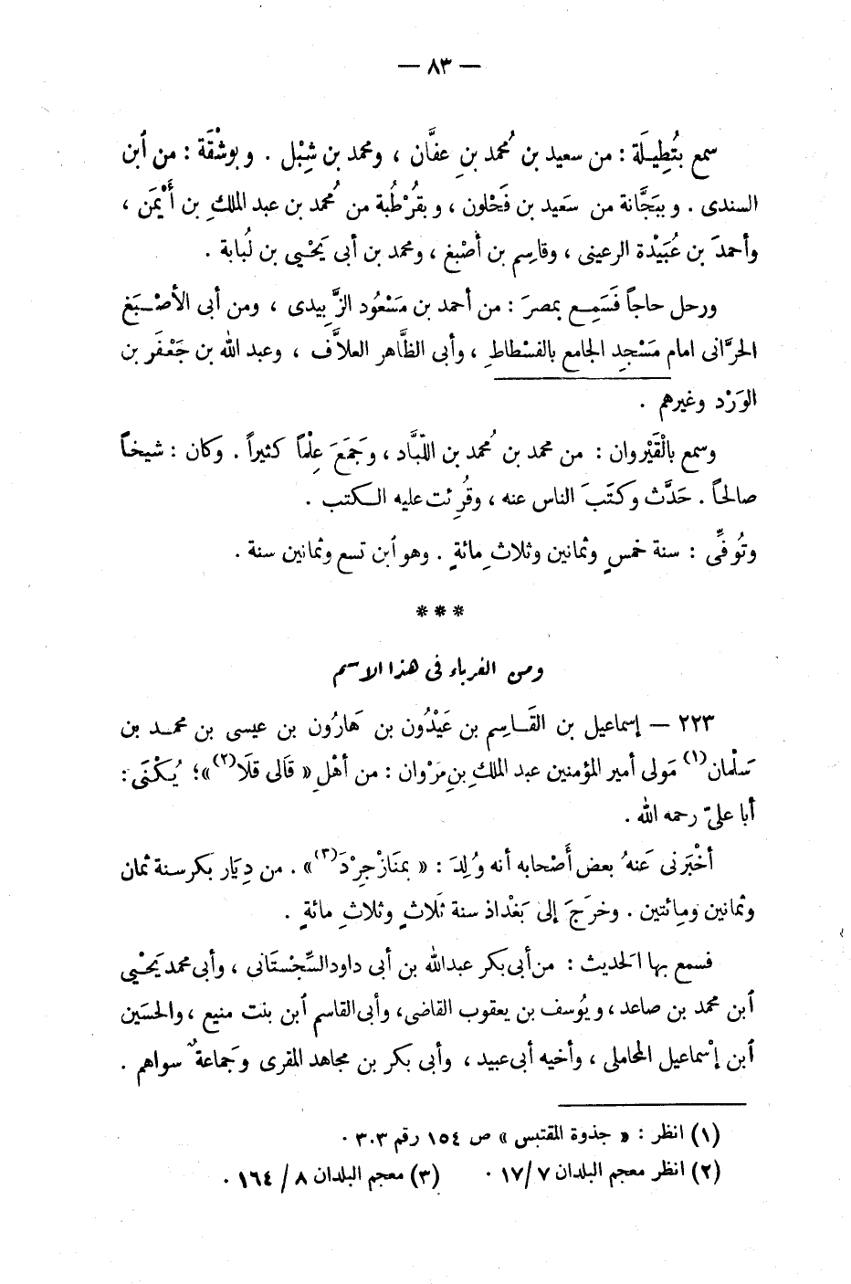 223 - إسماعيل بن القَاسِم بن عَيْدُون بن هَارُون بن عيسى بن محمد بن سَلْمان مَولى أمير المؤمنين عبدِ الملكِ بِن مَرْوان: من أهل) قَالى قلاَ (2 () ؛ يُكَنَّى: أبا عليّ رحمه الله.