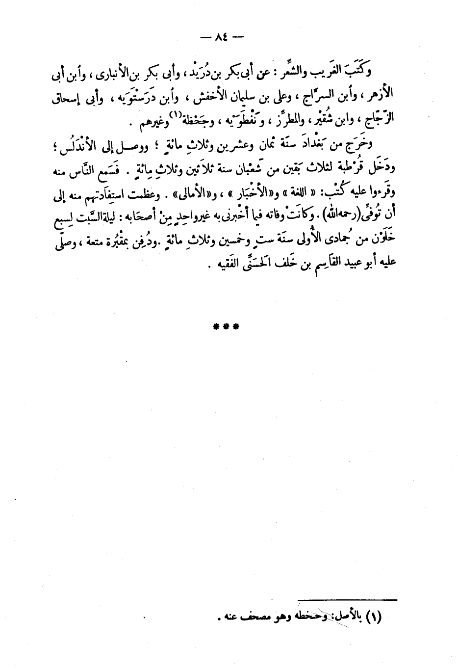 وخَرَج من بَغْدادَ سنَة ثمانِ وعشرين وثلاثِ مائةٍ، ووصل إلى الأنْدَلُس؛ ودَخَل قُرْطبة لثلاث بَقين من شَعْبان سنة ثلاثين وثلاثِ مِائةٍ. فَسَمِع النَّاس منه وقَرءوا عليه كُتْب:) اللغة (و) الأخْبَار (، و) الأمالي (. وعظمت استِفادتهم منه إلى أن تُوفِّيَ (رحمه الله) . وكانتْ وفاته فيما أخبرني به غير واحدٍ مِنْ أصحَابه: ليلة السَّبت لِسبع خَلَوْن من جُمادى الأُولى سنَة ستٍ وخمسين وثلاثِ مِائةٍ. ودُفِن بمقْبُرة متعة، وصلّى عليه أبو عبيد القَاسِم بن خَلف الحَسَنِّي الفَقيه.