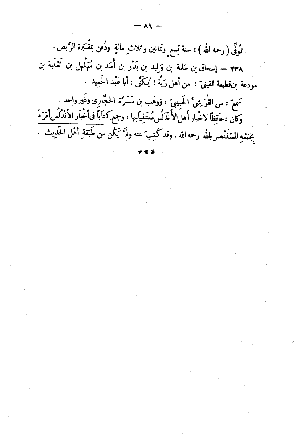 238 - إسحاق بن سَلمة بن وَليد بن بَدْر بن أَسَد بن مُهَلهل بن ثَعْلَبة بن مودعة بن قطيعة القينيّ: من أهل رَيَّة؛ يُكَنَّى: أبا عَبْد الحَميد.