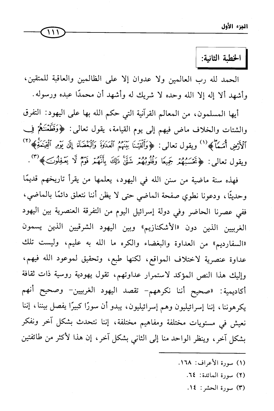 فهذه سنة ماضية من سنن الله في اليهود، يعلمها من يقرأ تاريخهم قديمًا وحديثًا، ودعونا نطوي صفحة الماضي حتى لا يظن أننا نتعلق دائمًا بالماضي، ففي عصرنا الحاضر وفي دولة إسرائيل اليوم من التفرقة العنصرية بين اليهود الغربيين الذين دون «الأشكنازيم» وبين اليهود الشرقيين الذين يسمون «السفارديم» من العداوة والبغضاء والكره ما الله به عليم، وليست تلك عداوة عنصرية لاختلاف المواقع، لكنها طبع، وتحقيق لموعود الله فيهم، وإليك هذا النص المؤكد لاستمرار عداوتهم، تقول يهودية روسية ذات ثقافة أكاديمية: «صحيح أننا نكرههم- تقصد اليهود الغربيين- وصحيح أنهم يكرهوننا، إننا إسرائيليون وهم إسرائيليون، يبدو أن سورًا كبيرًا يفصل بيننا، إننا نعيش في مستويات مختلفة ومفاهيم مختلفة، إننا نتحدث بشكل آخر ونفكر بشكل آخر، وينظر الواحد منا إلى الثاني بشكل آخر، إن هذا لأكثر من طائفتين