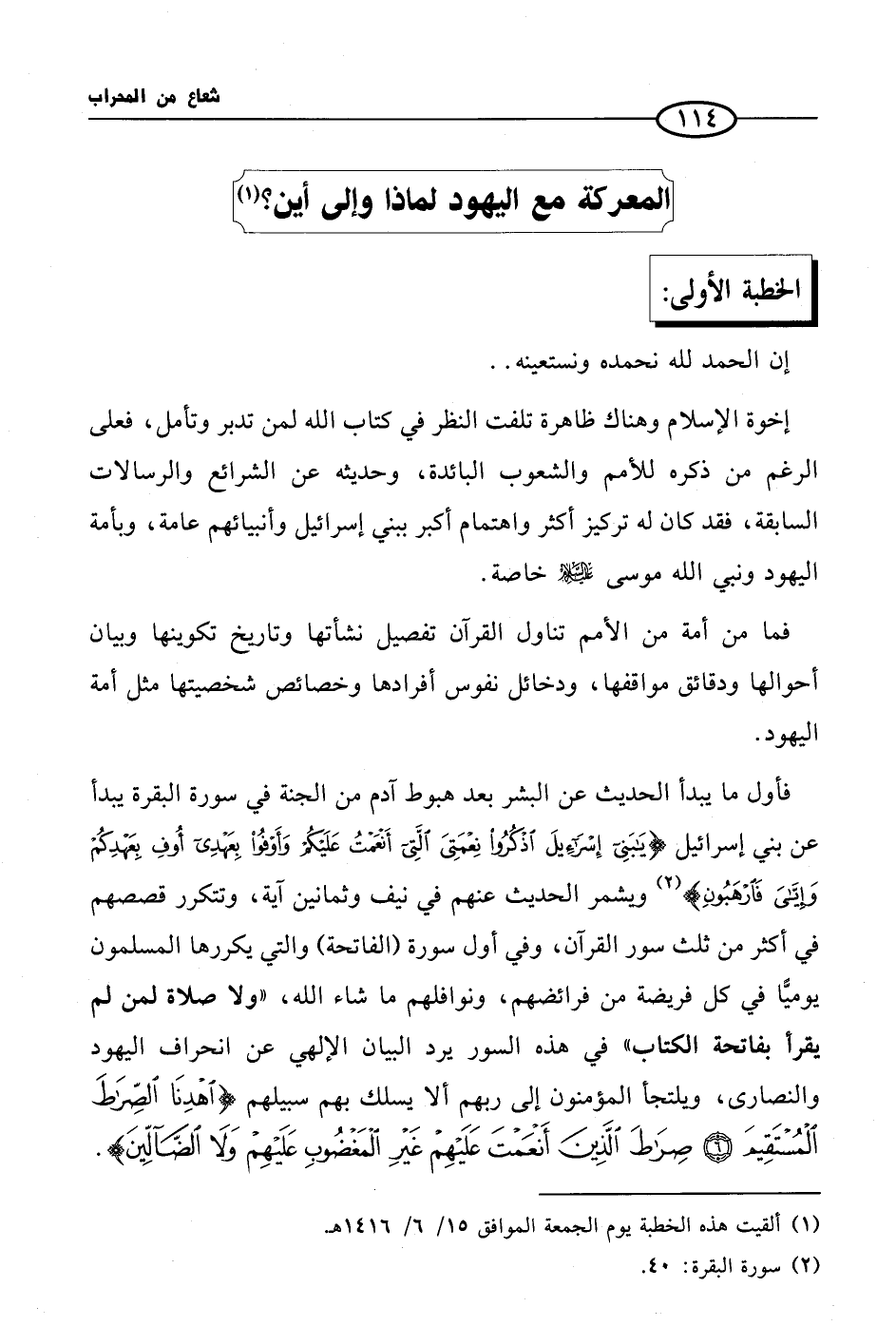 فأول ما يبدأ الحديث عن البشر بعد هبوط آدم من الجنة في سورة البقرة يبدأ عن بني إسرائيل {يا بني إسرائيل اذكروا نعمتي التي أنعمت عليكم وأوفوا بعهدي أوف بعهدكم وإياي فارهبون} (¬2) ويشمر الحديث عنهم في نيف وثمانين آية، وتتكرر قصصهم في أكثر من ثلث سور القرآن، وفي أول سورة (الفاتحة) والتي يكررها المسلمون يوميًّا في كل فريضة من فرائضهم، ونوافلهم ما شاء الله، «ولا صلاة لمن لم يقرأ بفاتحة الكتاب» في هذه السور يرد البيان الإلهي عن انحراف اليهود والنصارى، ويلتجأ المؤمنون إلى ربهم ألا يسلك بهم سبيلهم {اهدنا الصراط المستقيم صراط الذين أنعمت عليهم غير المغضوب عليهم ولا الضالين}.