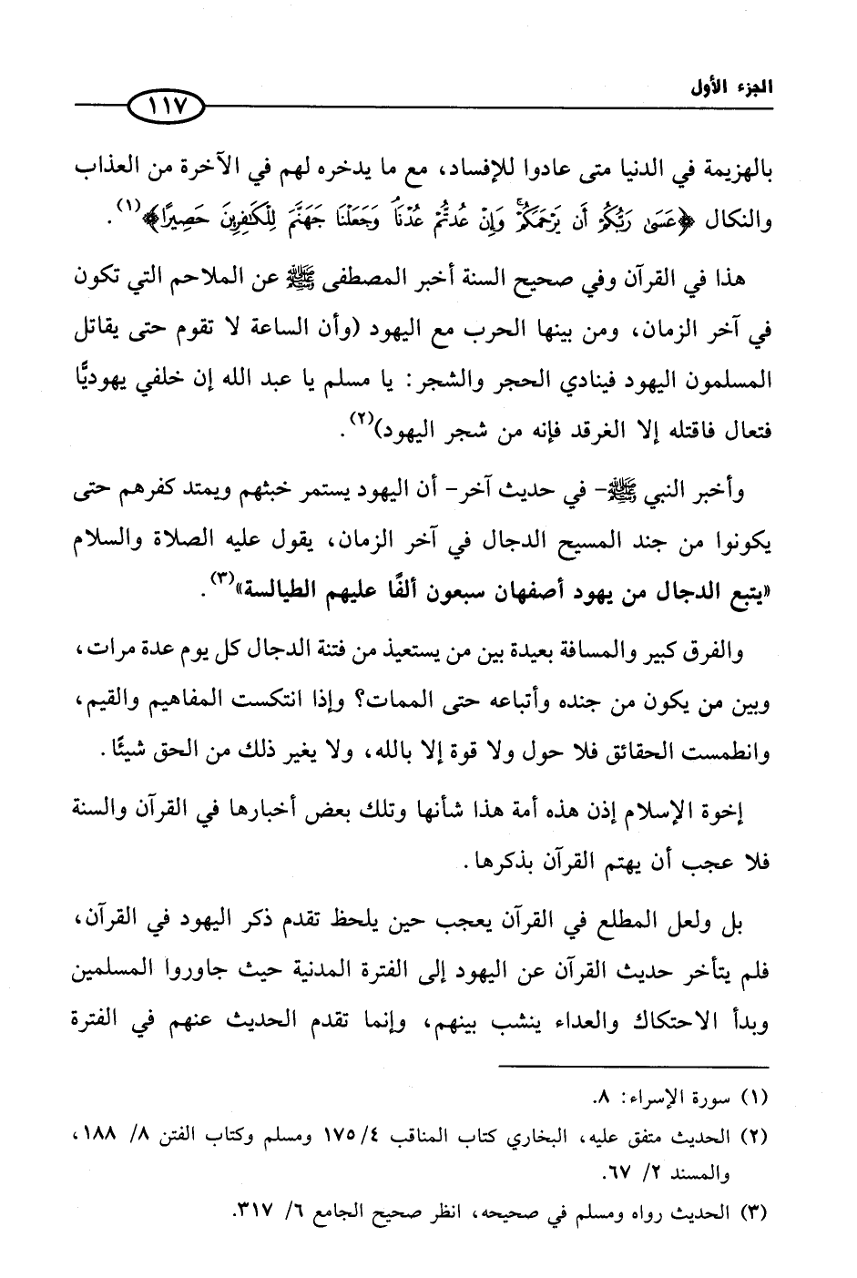 هذا في القرآن وفي صحيح السنة أخبر المصطفى صلى الله عليه وسلم عن الملاحم التي تكون في آخر الزمان، ومن بينها الحرب مع اليهود (وأن الساعة لا تقوم حتى يقاتل المسلمون اليهود فينادي الحجر والشجر: يا مسلم يا عبد الله إن خلفي يهوديًّا فتعال فاقتله إلا الغرقد فإنه من شجر اليهود) (¬2).