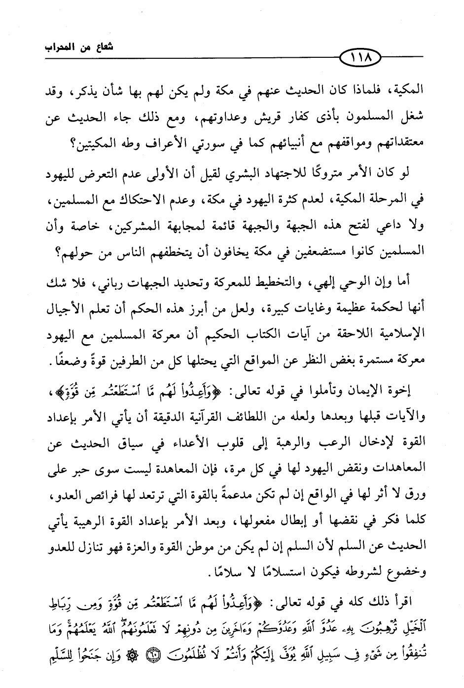 إخوة الإيمان وتأملوا في قوله تعالى {وأعدوا لهم ها استطعتم من قوة}، والآيات قبلها وبعدها ولعله من اللطائف القرآنية الدقيقة أن يأتي الأمر بإعداد القوة لإدخال الرعب والرهبة إلى قلوب الأعداء في سياق الحديث عن المعاهدات ونقض اليهود لها في كل مرة، فإن المعاهدة ليست سوى حبر على ورق لا أثر لها في الواقع إن لم تكن مدعمةً بالقوة التي ترتعد لها فرائص العدو، كلما فكر في نقضها أو إبطال مفعولها، وبعد الأمر بإعداد القوة الرهيبة يأتي الحديث عن السلم لأن السلم إن لم يكن من موطن القوة والعزة فهو تنازل للعدو وخضوع لشروطه فيكون استسلامًا لا سلامًا.