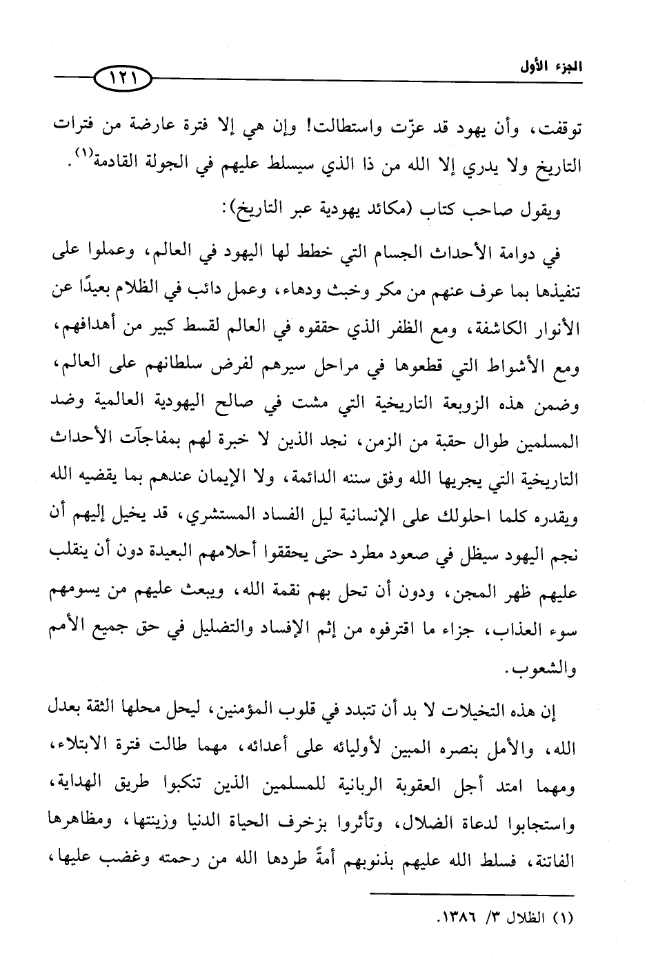 توقفت، وأن يهود قد عزّت واستطالت! وإن هي إلا فترة عارضة من فترات التاريخ ولا يدري إلا الله من ذا الذي سيسلط عليهم في الجولة القادمة (¬1).
