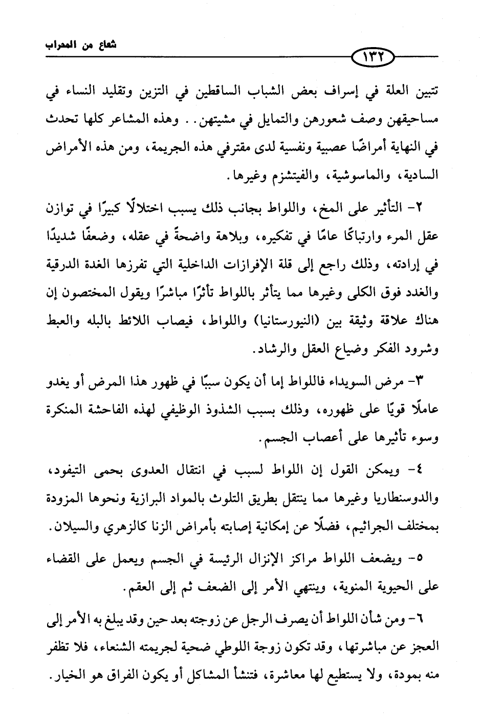 3 - مرض السويداء فاللواط إما أن يكون سببًا في ظهور هذا المرض أو يغدو عاملاً قويًا على ظهوره، وذلك بسبب الشذوذ الوظيفي لهذه الفاحشة المنكرة وسوء تأثيرها على أعصاب الجسم.