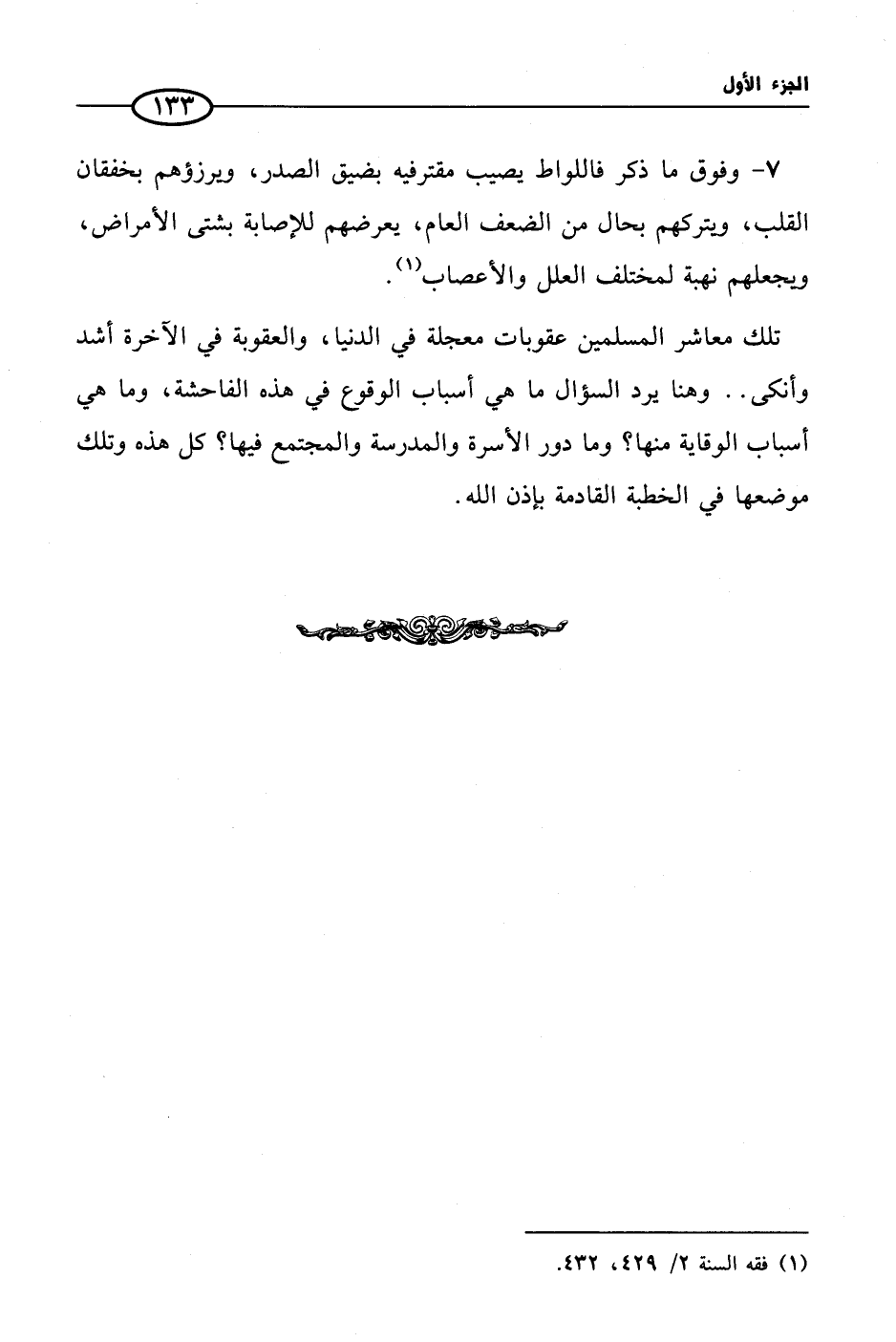 تلك معاشر المسلمين عقوبات معجلة في الدنيا، والعقوبة في الآخرة أشد وأنكى .. وهنا يرد السؤال ما هي أسباب الوقوع في هذه الفاحشة، وما هي أسباب الوقاية منها؟ وما دور الأسرة والمدرسة والمجتمع فيها؟ كل هذه وتلك موضعها في الخطبة القادمة بإذن الله.