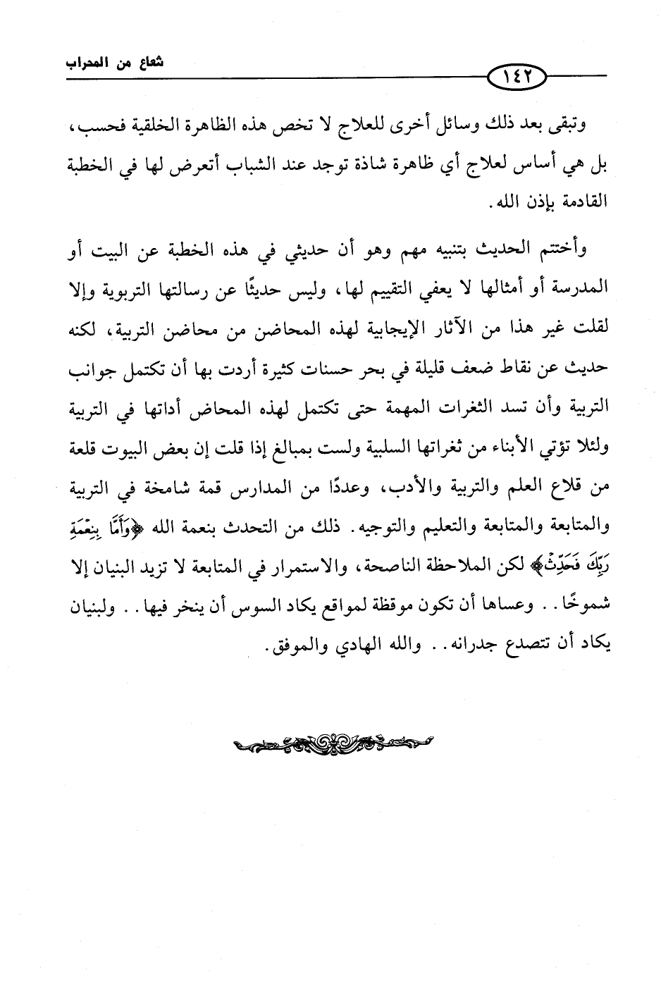 وأختتم الحديث بتنبيه مهم وهو أن حديثي في هذه الخطبة عن البيت أو المدرسة أو أمثالها لا يعفي التقييم لها، وليس حديثًا عن رسالتها التربوية وإلا لقلت غير هذا من الآثار الإيجابية لهذه المحاضن من محاضن التربية، لكنه حديث عن نقاط ضعف قليلة في بحر حسنات كثيرة أردت بها أن تكتمل جوانب التربية وأن تسد الثغرات المهمة حتى تكتمل لهذه المحاض أداتها في التربية ولئلا تؤتي الأبناء من ثغراتها السلبية ولست بمبالغ إذا قلت إن بعض البيوت قلعة من قلاع العلم والتربية والأدب، وعددًا من المدارس قمة شامخة في التربية والمتابعة والمتابعة والتعليم والتوجيه. ذلك من التحدث بنعمة الله {وأما بنعمة ربك فحدث} لكن الملاحظة الناصحة، والاستمرار في المتابعة لا تزيد البنيان إلا شموخًا .. وعساها أن تكون موقظة لمواقع يكاد السوس أن ينخر فيها .. ولبنيان يكاد أن تتصدع جدرانه .. والله الهادي والموفق.