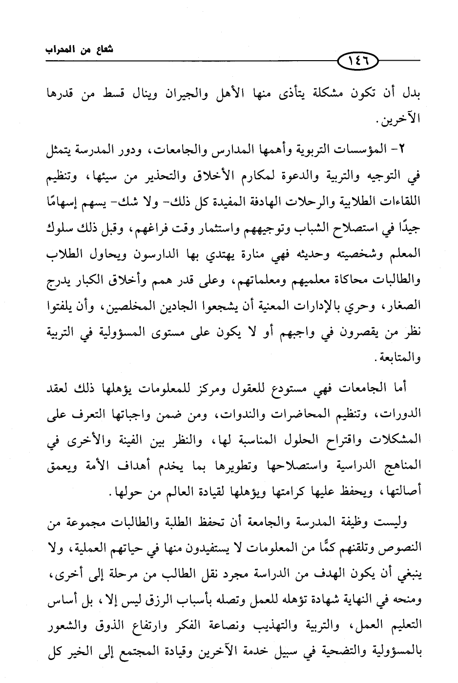 أما الجامعات فهي مستودع للعقول ومركز للمعلومات يؤهلها ذلك لعقد الدورات، وتنظيم المحاضرات والندوات، ومن ضمن واجباتها التعرف على المشكلات واقتراح الحلول الناسبة لها، والنظر بين الفينة والأخرى في المناهج الدراسية واستصلاحها وتطويرها بما يخدم أهداف الأمة ويعمق أصالتها، ويحفظ عليها كرامتها ويؤهلها لقيادة العالم من حولها.
