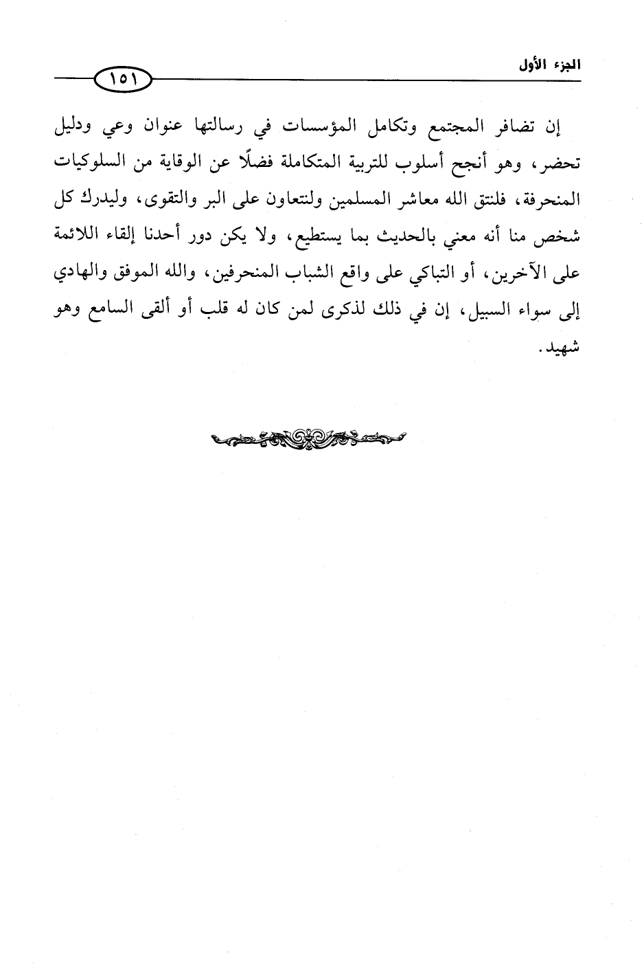 إن تضافر المجتمع وتكامل المؤسسات في رسالتها عنوان وعي ودليل تحضر، وهو أنجح أسلوب للتربية المتكاملة فضلاً عن الوقاية من السلوكيات المنحرفة، فلنتق الله معاشر المسلمين ولنتعاون على البر والتقوى، وليدرك كل شخص منا أنه معني بالحديث بما يستطيع، ولا يكن دور أحدنا إلقاء اللائمة على الآخرين، أو التباكي على واقع الشباب المنحرفين، والله الموفق والهادي إلى سواء السبيل، إن في ذلك لذكرى لمن كان له قلب أو ألقى السامع وهو شهيد.
