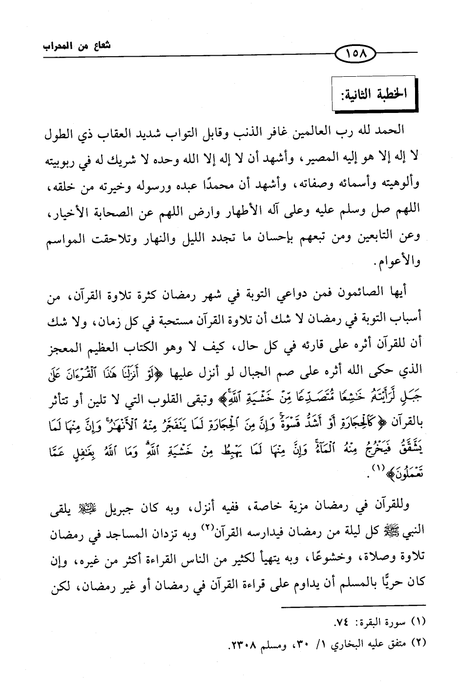 أيها الصائمون فمن دواعي التوبة في شهر رمضان كثرة تلاوة القرآن، من أسباب التوبة في رمضان لا شك أن تلاوة القرآن مستحبة في كل زمان، ولا شك أن للقرآن أثره على قارئه في كل حال، كيف لا وهو الكتاب العظيم المعجز الذي حكى الله أثره على صم الجبال لو أنزل عليها {لو أنزلنا هذا القرآن على جبل لرأيته خاشعًا متصدعًا من خشية الله} وتبقى القلوب التي لا تلين أو تتأثر بالقرآن {كالحجارة أو أشد قسوة، وإن من الحجارة لما يتفجر منه الأنهار، وإن منها لما يشقق فيخرج منه الماء وإن منها لما يهبط من خشية الله وما الله بغافل عما تعملون} (¬1).