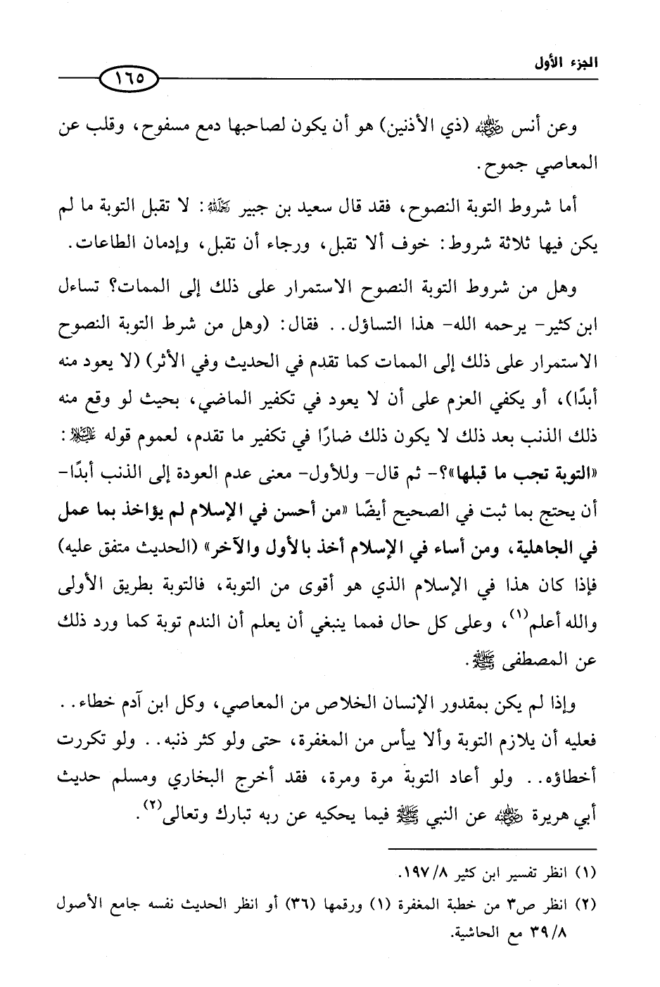 وهل من شروط التوبة النصوح الاستمرار على ذلك إلى الممات؟ تساءل ابن كثير- يرحمه الله- هذا التساؤل .. فقال: (وهل من شرط التوبة النصوح الاستمرار على ذلك إلى الممات كما تقدم في الحديث وفي الأثر) (لا يعود منه أبدًا)، أو يكفي العزم على أن لا يعود في تكفير الماضي، بحيث لو وقع منه ذلك الذنب بعد ذلك لا يكون ذلك ضارًا في تكفير ما تقدم، لعموم قوله عليه السلام: «التوبة تجب ما قبلها»؟ - ثم قال- وللأول- معنى عدم العودة إلى الذنب أبدًا- أن يحتج بما ثبت في الصحيح أيضًا «من أحسن في الإسلام لم يؤاخذ بما عمل في الجاهلية، ومن أساء في الإسلام أخذ بالأول والآخر» (الحديث متفق عليه) فإذا كان هذا في الإسلام الذي هو أقوى من التوبة، فالتوبة بطريق الأولى والله أعلم (¬1) وعلى كل حال فمما ينبغي أن يعلم أن الندم توبة كما ورد ذلك عن المصطفى صلى الله عليه وسلم.