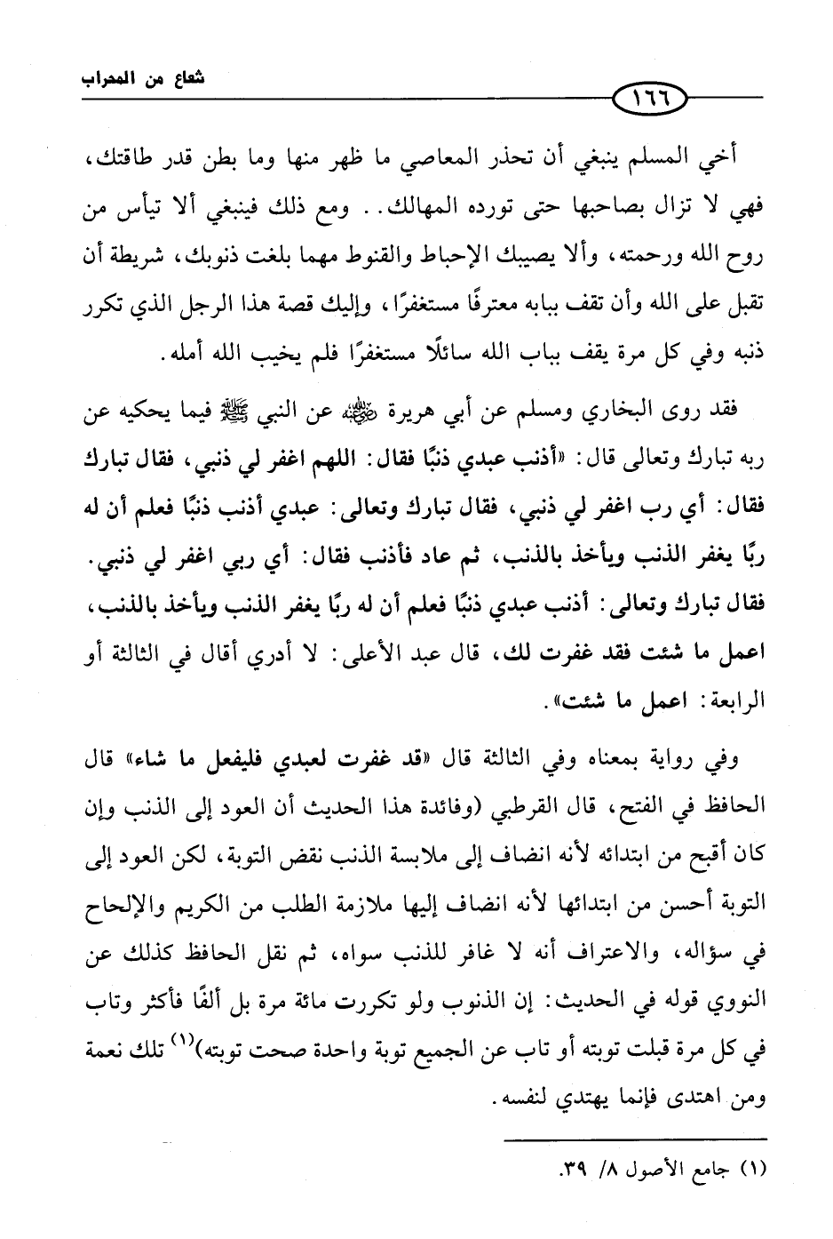 أخي المسلم ينبغي أن تحذر المعاصي ما ظهر منها وما بطن قدر طاقتك، فهي لا تزال بصاحبها حتى تورده المهالك .. ومع ذلك فينبغي ألا تيأس من روح الله ورحمته، وألا يصيبك الإحباط والقنوط مهما بلغت ذنوبك، شريطة أن تقبل على الله وأن تقف ببابه معترفًا مستغفرًا، وإليك قصة هذا الرجل الذي تكرر ذنبه وفي كل مرة يقف بباب الله سائلاً مستغفرًا فلم يخيب الله أمله. فقد روى البخاري ومسلم عن أبي هريرة رضي الله عنه عن النبي صلى الله عليه وسلم فيما يحكيه عن ربه تبارك وتعالى قال: «أذنب عبدي ذنباً فقال: اللهم اغفر لي ذنبي، فقال تبارك فقال: أي رب اغفر لي ذنبي، فقال تبارك وتعالى: عبدي أذنب ذنبًا فعلم أن له ربًا يغفر الذنب ويأخذ بالذنب، ثم عاد فأذنب فقال: أي ربي أغفر لي ذنبي. فقال تبارك وتعالى: أذنب عبدي ذنبًا فعلم أن له ربًا يغفر الذنب ويأخذ بالذنب، اعمل ما شئت فقد غفرت لك، قال عبد الأعلى: لا أدري أقال في الثالثة أو الرابعة اعمل ما شئت».