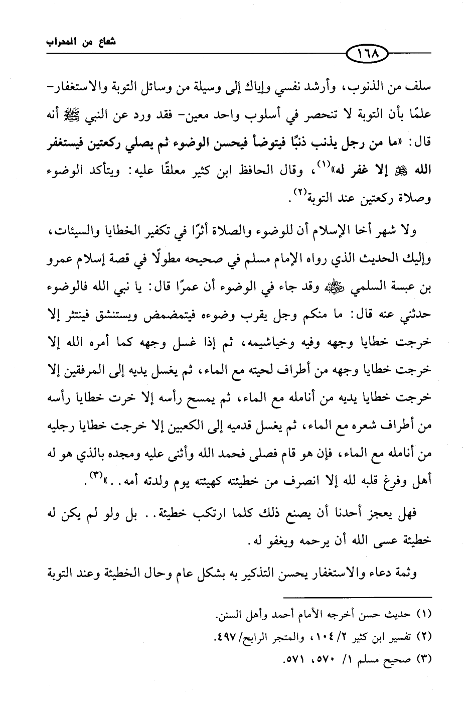 سلف من الذنوب، وأرشد نفسي وإياك إلى وسيلة من وسائل التوبة والاستغفار- علمًا بأن التوبة لا تنحصر في أسلوب واحد معين- فقد ورد عن النبي صلى الله عليه وسلم أنه قال: «ما من رجل يذنب ذنبًا فيتوضأ فيحسن الوضوء ثم يصلي ركعتين فيستغفر الله عز وجل إلا غفر له» (¬1)، وقال الحافظ ابن كثير معلقًا عليه: ويتأكد الوضوء وصلاة ركعتين عند التوبة (¬2).
