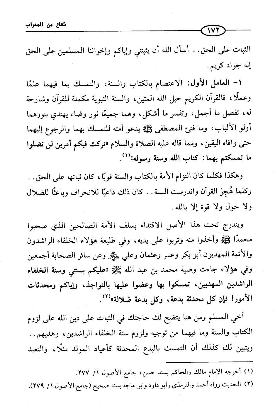 1 - العامل الأول: الاعتصام بالكتاب والسنة، والتمسك بما فيهما علمًا وعملاً، فالقرآن الكريم حبل الله المتين، والسنة النبوية مكملة للقرآن وشارحة له، تفصل ما أجمل، وتفسر ما أشكل، وهما جميعًا نور وضاء يهتدي بنورهما أولو الألباب، وما فتئ المصطفى صلى الله عليه وسلم يدعو أمته للتمسك بهما والرجوع إليهما حتى وافاه اليقين، ومما قاله عليه الصلاة والسلام «تركت فيكم أمرين لن تضلوا ما تمسكتم بهما: كتاب الله وسنة رسوله» (¬1).