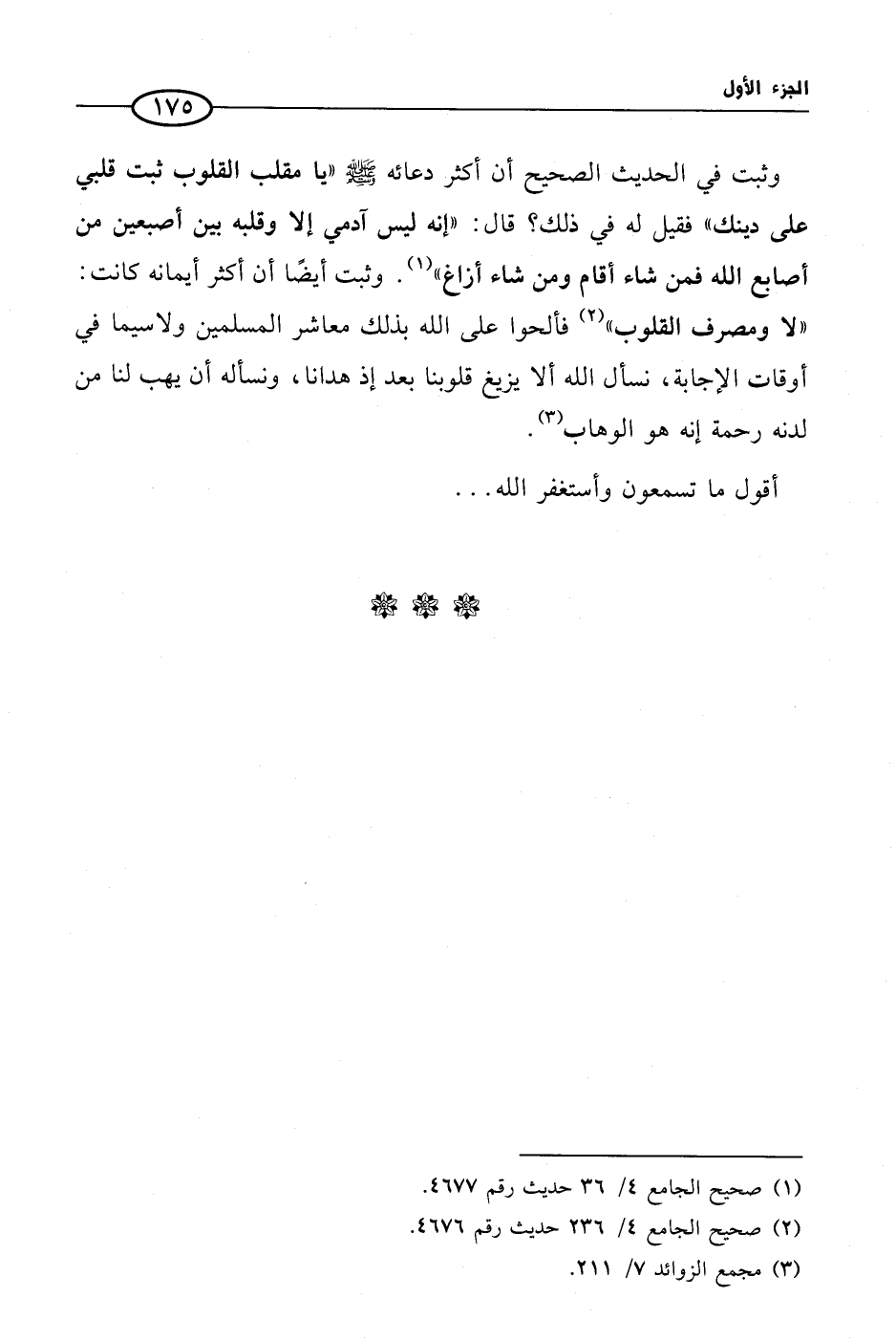 وثبت في الحديث الصحيح أن أكثر دعائه صلى الله عليه وسلم «يا مقلب القلوب ثبت قلبي على دينك» فقيل له في ذلك؟ قال: «إنه ليس آدمي إلا وقلبه بين أصبعين من أصابع الله فمن شاء أقام ومن شاء أزاغ» (¬1). وثبت أيضًا أن أكثر أيمانه كانت: «لا ومصرف القلوب» (¬2) فألحوا على الله بذلك معاشر المسلمين ولاسيما في أوقات الإجابة، نسأل الله ألا يزيغ قلوبنا بعد إذ هدانا، ونسأله أن يهب لنا من لدنه رحمة إنه هو الوهاب (¬3).