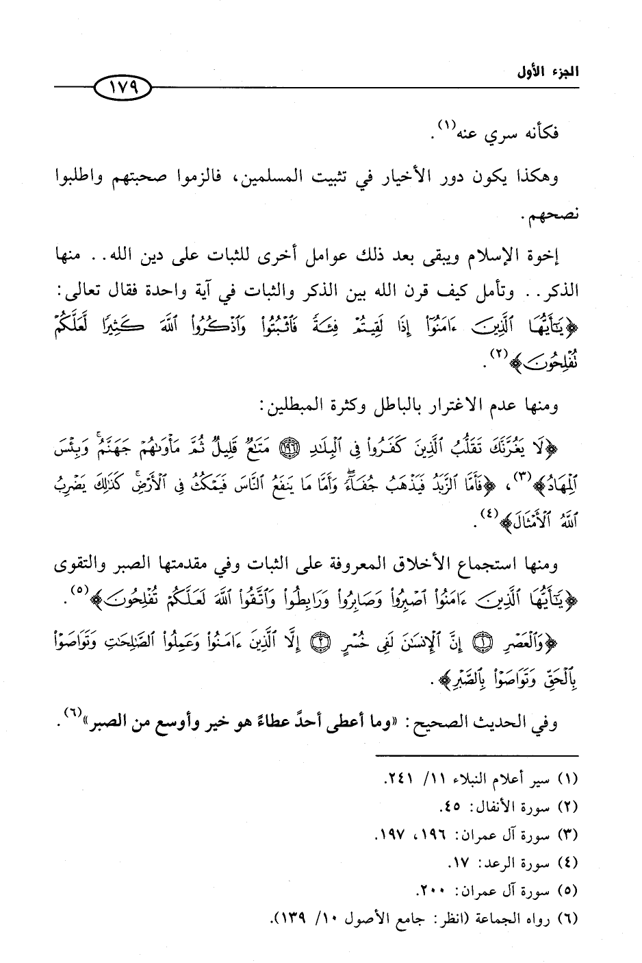 ومنها عدم الاغترار بالباطل وكثرة المبطلين {لا يغرنك تقلب الذين كفروا في البلاد متاع قليل ثم مأواهم جهنم وبئس المهاد} (¬3) {فأما الزبد فيذهب جفاء وأما ما ينفع الناس فيمكث في الأرض كذلك يضرب الله الأمثال} (¬4).