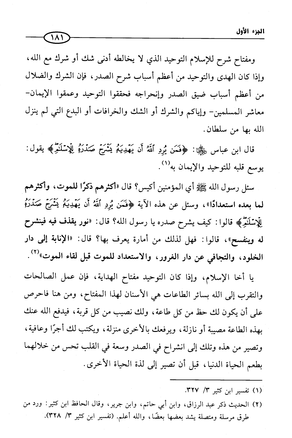 قال ابن عباس رضي الله عنهما {فمن يرد الله أن يهديه يشرح صدره للإسلام} يقول: يوسع قلبه للتوحيد والإيمان به (¬1).