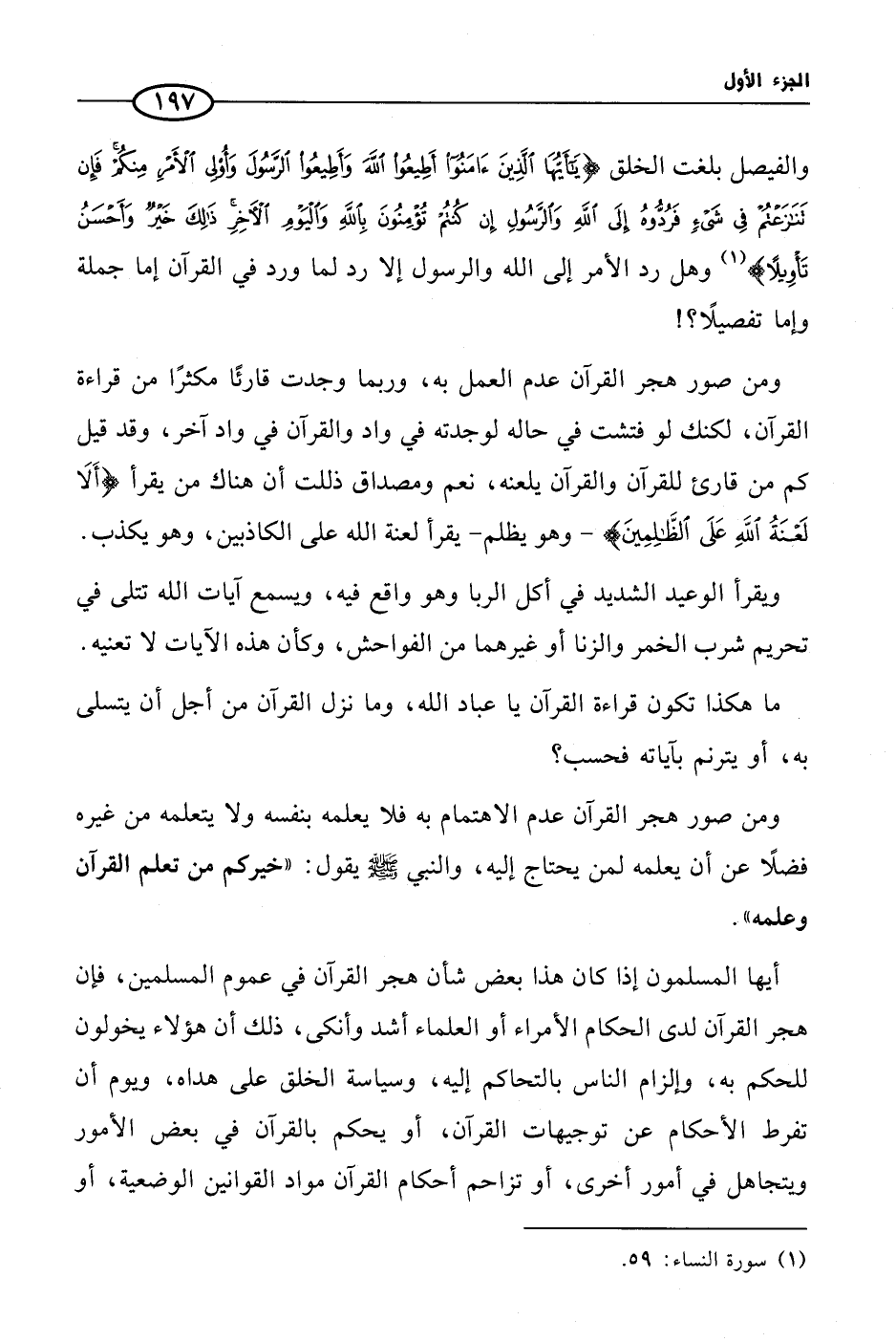 والفيصل بلغت الخلق {يا أيها الذين آمنوا أطيعوا الله وأطيعوا الرسول وأولي الأمر منكم فإن تنازعتم في شيء فردوه إلى الله والرسول إن كنتم تؤمنون بالله واليوم الآخر ذلك خير وأحسن تأويلاً} (¬1) وهل رد الأمر إلى الله والرسول إلا رد لما ورد في القرآن إما جملة وإما تفصيلاً؟ !