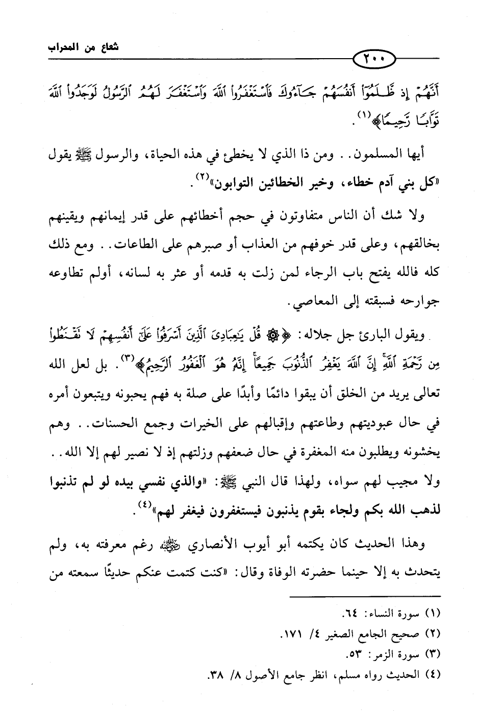 ولا شك أن الناس متفاوتون في حجم أخطائهم على قدر إيمانهم ويقينهم بخالقهم، وعلى قدر خوفهم من العذاب أو صبرهم على الطاعات .. ومع ذلك كله فالله يفتح باب الرجاء لمن زلت به قدمه أو عثر به لسانه، أولم تطاوعه جوارحه فسبقته إلى المعاصي. ويقول البارئ جل جلاله: {قل يا عبادي الذين أسرفوا على أنفسهم لا تقنطوا من رحمة الله إن الله يغفر الذنوب جميعًا إنه هو الغفور الرحيم} (¬3). بل لعل الله تعالى يريد من الخلق أن يبقوا دائمًا وأبدًا على صلة به فهم يحبونه ويتبعون أمره في حال عبوديتهم وطاعتهم وإقبالهم على الخيرات وجمع الحسنات .. وهم يخشونه ويطلبون منه المغفرة في حال ضعفهم وزلتهم إذ لا نصير لهم إلا الله .. ولا مجيب لهم سواه، ولهذا قال النبي صلى الله عليه وسلم: «والذي نفسي بيده لو لم تذنبوا لذهب الله بكم ولجاء بقوم يذنبون فيستغفرون فيغفر لهم» (¬4).