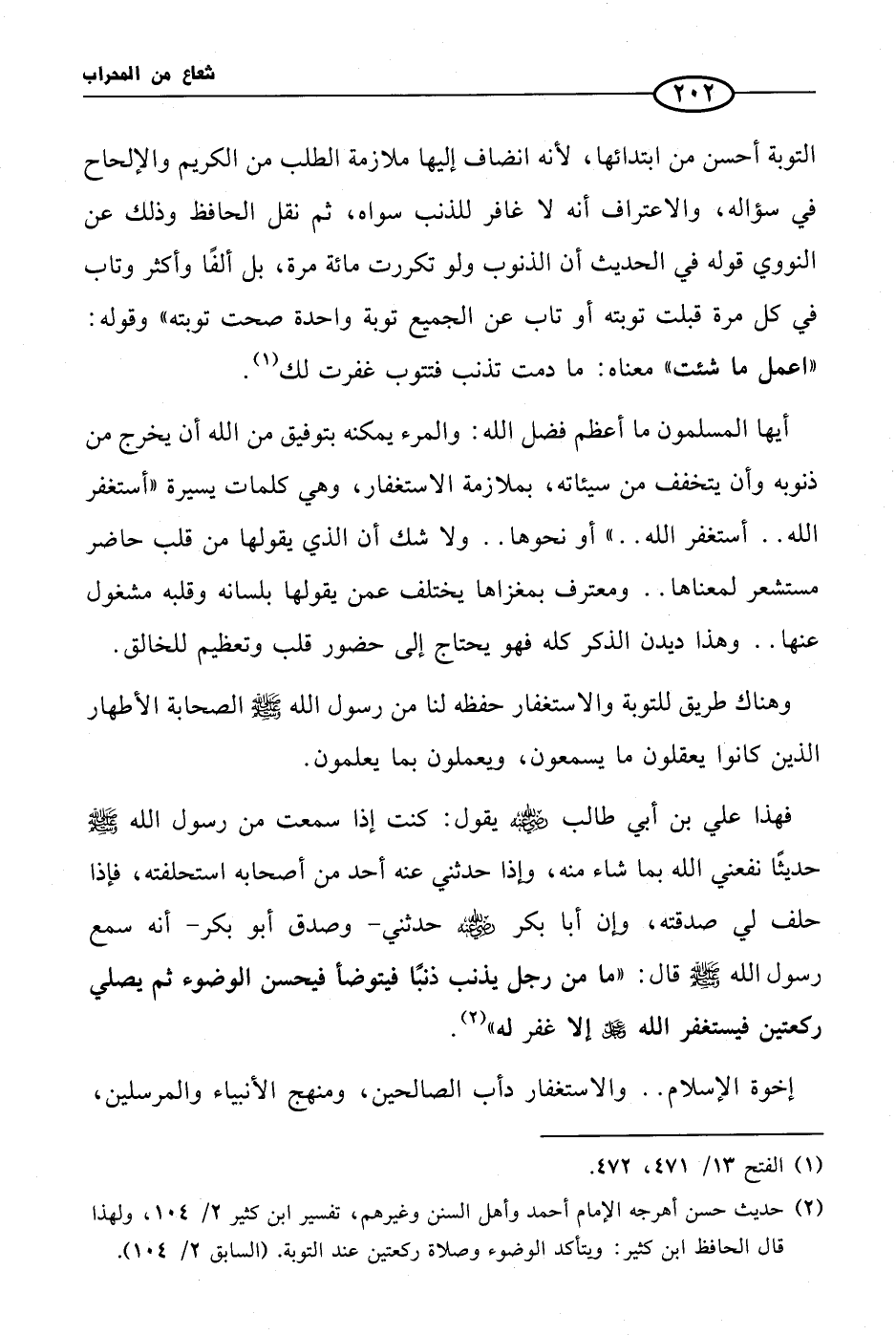 (¬2) حديث حسن أهرجه الإمام أحمد وأهل السنن وغيرهم، تفسير ابن كثير 2/ 104، ولهذا قال الحافظ ابن كثير: ويتأكد الوضوء وصلاة ركعتين عند التوبة. (السابق 2/ 104).