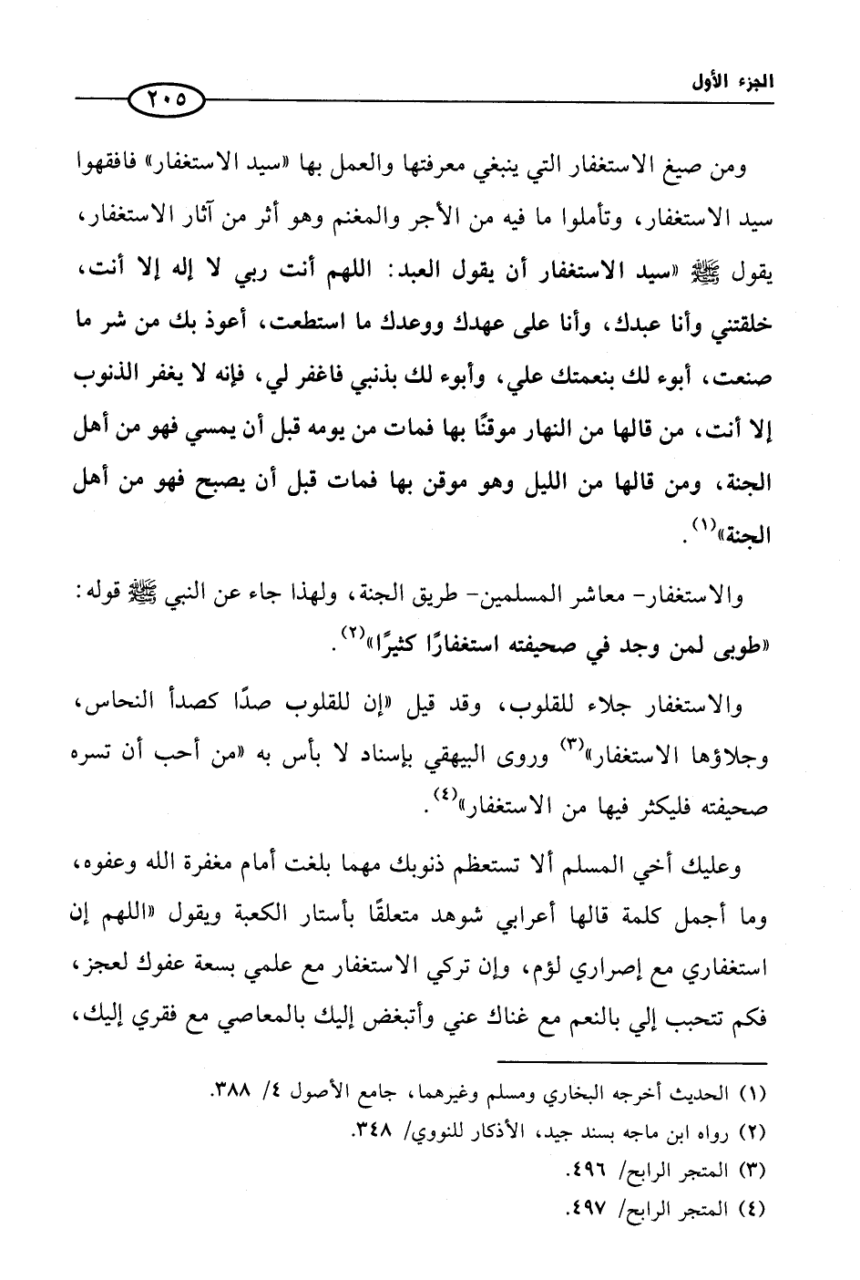 والاستغفار جلاء للقلوب، وقد قيل «إن للقلوب صدأً كصدأ النحاس، وجلاؤها الاستغفار» (¬3) وروى البيهقي بإسناد لا بأس به «من أحب أن تسره صحيفته فليكثر فيها من الاستغفار» (¬4).