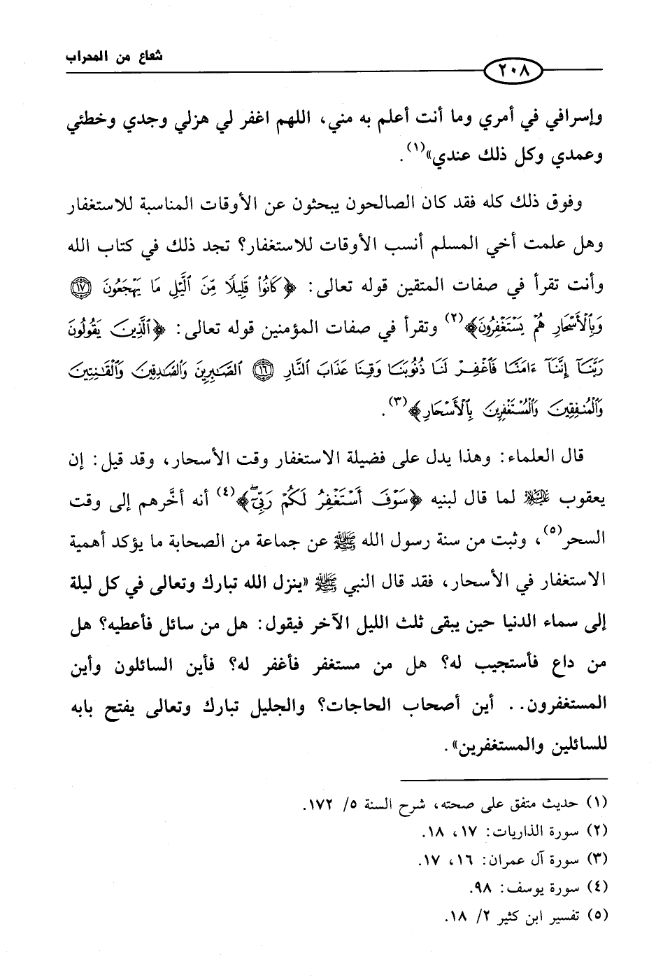 وفوق ذلك كله فقد كان الصالحون يبحثون عن الأوقات المناسبة للاستغفار وهل علمت أخي المسلم أنسب الأوقات للاستغفار؟ تجد ذلك في كتاب الله وأنت تقرأ في صفات المتقين قوله تعالى: {كانوا قليلاً من الليل ما يهجعون وبالأسحار هم يستغفرون} (¬2) وتقرأ في صفات المؤمنين قوله تعالى {الذين يقولون ربنا إننا آمنا فاغفر لنا ذنوبنا وقنا عذاب النار الصابرين والصادقين والقانتين والمنفقين والمستغفرين بالأسحار} (¬3) قال العلماء: وهذا يدل على فضيلة الاستغفار وقت الأسحار، وقد قيل: إن يعقوب عليه السلام لما قال لبنيه {سوف أستغفر لكم ربي} (¬4) أنه أخرهم إلى وقت السحر (¬5)، وثبت من سنة رسول الله صلى الله عليه وسلم عن جماعة من الصحابة ما يؤكد أهمية الاستغفار في الأسحار، فقد قال البني صلى الله عليه وسلم «ينزل الله تبارك وتعالى في كل ليلة إلى سماء الدنيا حين يبقى ثلث الليل الآخر فيقول: هل من سائل فأعطيه؟ هل من داع فأستجيب له؟ هل من مستغفر فأغفر له؟ فأين السائلون وأين المستغفرون .. أين أصحاب الحاجات؟ والجليل تبارك وتعالى يفتح بابه للسائلين والمستغفرين».