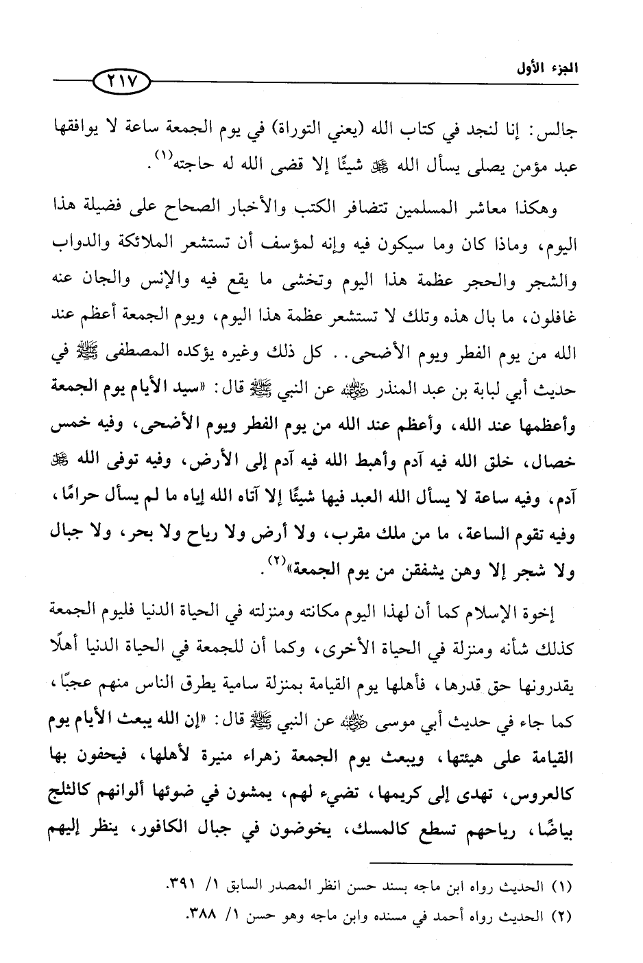 وهكذا معاشر المسلمين تتضافر الكتب والأخبار الصحاح على فضيلة هذا اليوم، وماذا كان وما سيكون فيه وإنه لمؤسف أن تستشعر الملائكة والدواب والشجر والحجر عظمة هذا اليوم وتخشى ما يقع فيه والإنس والجان عنه غافلون، ما بال هذه وتلك لا تستشعر عظمة هذا اليوم، ويوم الجمعة أعظم عند الله من يوم الفطر ويوم الأضحى .. كل ذلك وغيره يؤكده المصطفى صلى الله عليه وسلم في حديث أبي لبابه بن عبد المنذر رضي الله عنه عن النبي صلى الله عليه وسلم قال: «سيد الأيام يوم الجمعة وأعظمها عند الله، وأعظم عند الله من يوم الفطر ويوم الأضحى، وفيه خمس خصال، خلق الله فيه آدم وأهبط الله فيه آدم إلى الأرض، وفيه توفى الله عز وجل آدم، وفيه ساعة لا يسأل الله العبد فيها شيئًا إلا آتاه الله إياه ما لم يسأل حرامًا، وفيه تقوم الساعة، ما من ملك مقرب، ولا أرض ولا رياح ولا بحر، ولا جبال ولا شجر إلا وهن يشفقن من يوم الجمعة» (¬2).