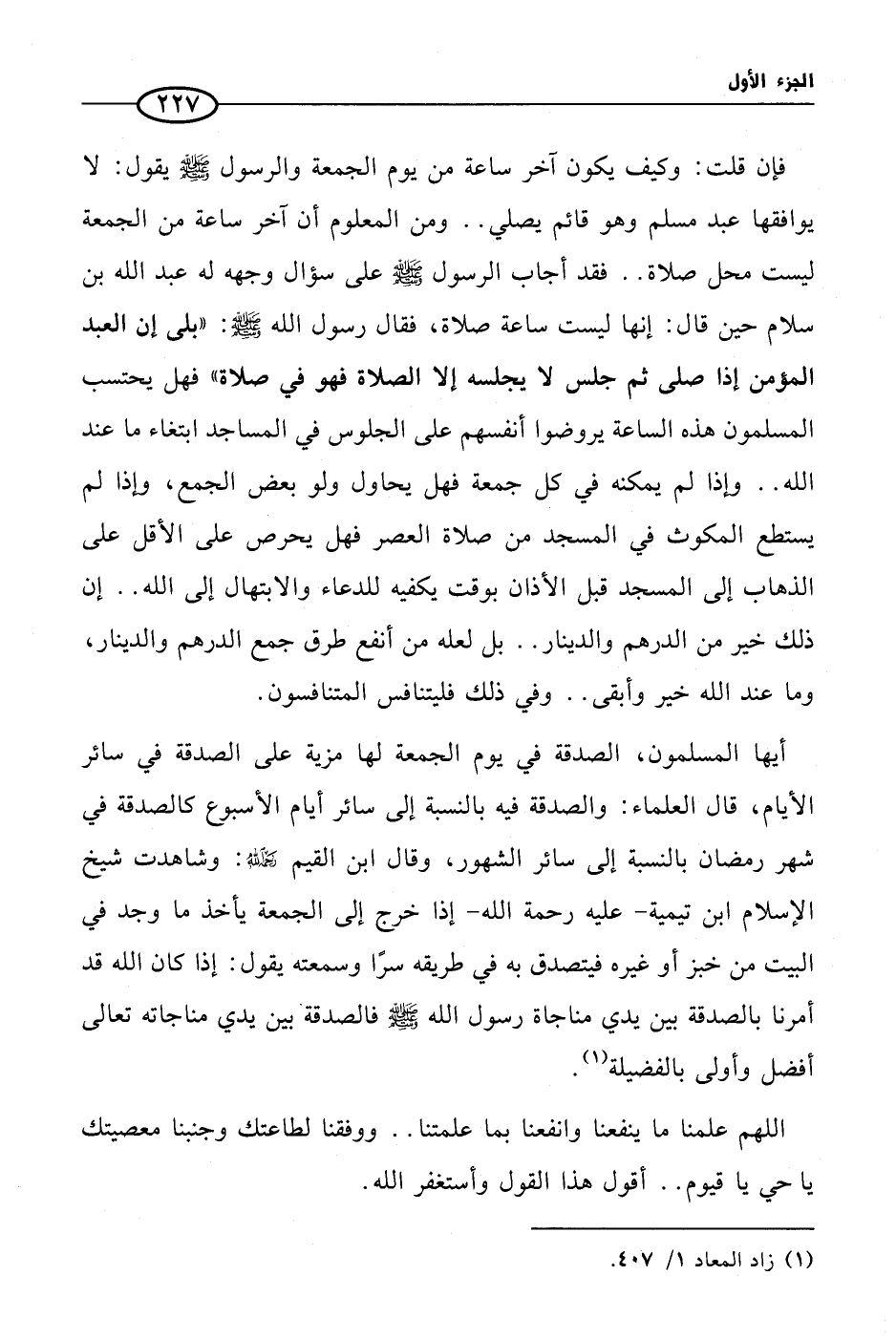 فإن قلت: وكيف يكون آخر ساعة من يوم الجمعة والرسول صلى الله عليه وسلم يقول: لا يوافقها عبد مسلم وهو قائم يصلي .. ومن المعلوم أن آخر ساعة من الجمعة ليست محل صلاة .. فقد أجاب الرسول صلى الله عليه وسلم على سؤال وجهه له عبد الله بن سلام حين قال: إنها ليست ساعة صلاة، فقال رسول الله صلى الله عليه وسلم: «بلى إن العبد المؤمن إذا صلى ثم جلس لا يجلسه إلا الصلاة فهو في صلاة» فهل يحتسب المسلمون هذه الساعة يروضوا أنفسهم على الجلوس في المساجد ابتغاء ما عند الله .. وإذا لم يمكنه في كل جمعة فهل يحاول ولو بعض الجمع، وإذا لم يستطع المكوث في المسجد من صلاة العصر فهل يحرص على الأقل على الذهاب إلى المسجد قبل الأذان بوقت يكفيه للدعاء والابتهال إلى الله .. إلى ذلك خير من الدرهم والدينار .. بل لعله من أنفع طرق جمع الدرهم والدينار، وما عند الله خير وأبقى .. وفي ذلك فليتنافس المتنافسون.